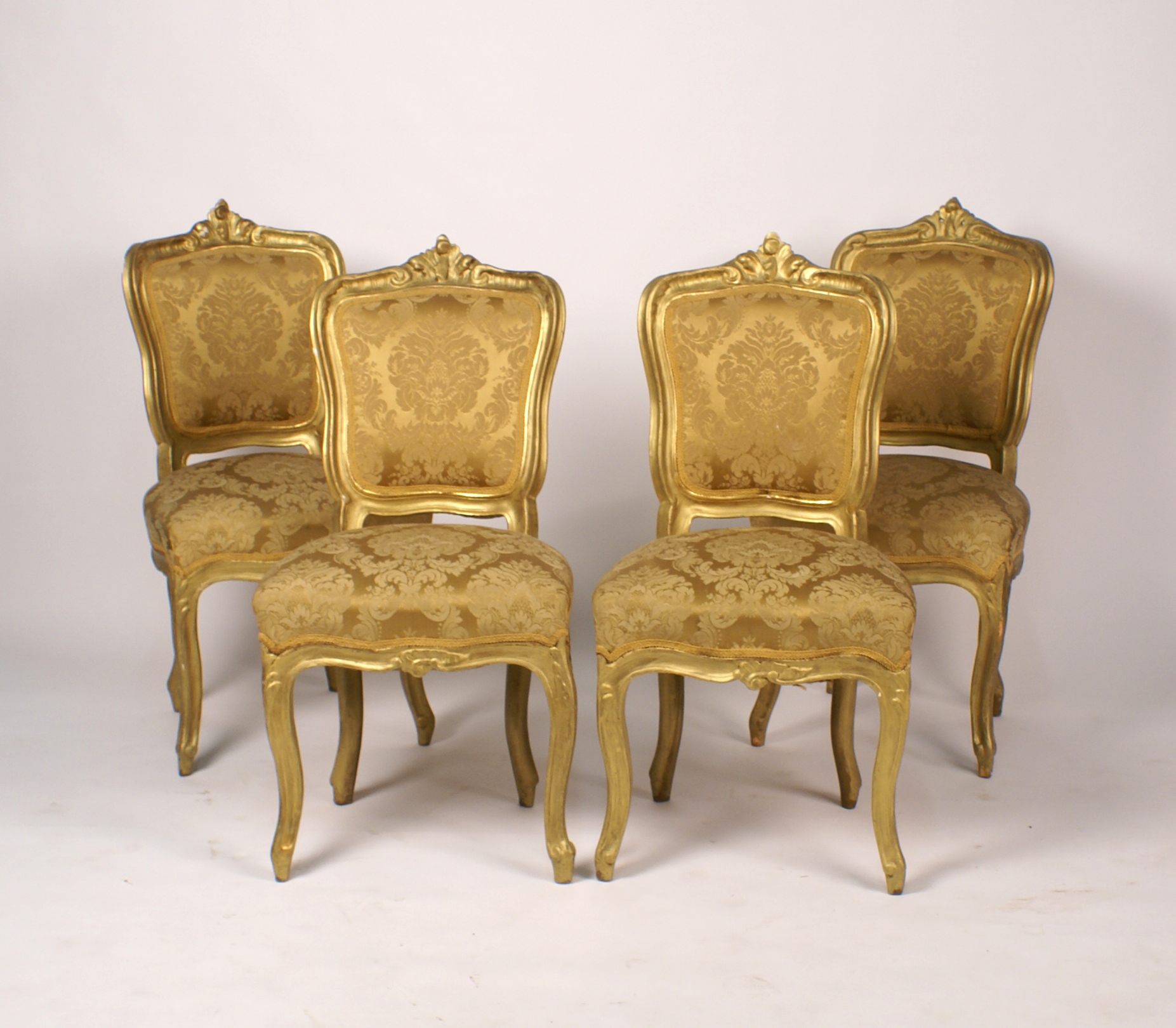 QUATTRO SEDIE IN LEGNO DORATO ED INTAGLIATO vecchia manifattura schienale e sedute in tessuto h. 93 cm.
