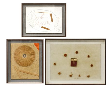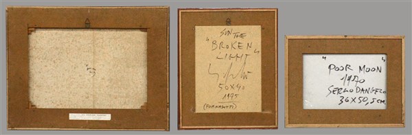 Lotto di tre opere: "Poor Moon" 1970, olio e collage su cartoncino, cm 36x50, firmato e titolato in basso; firmato, datato e titolato al retro. "The broken light" 1975, assemblage su faesite, cm 50x40, firmato in basso al centro; titolato, datato, firmato e iscritto al retro. "Fumer a 2000 mètres" olio e assemblage su tela, cm 50x70, firmato in basso al centro; etichetta al retro della "All Over Transport srl" con i dati dell'opera