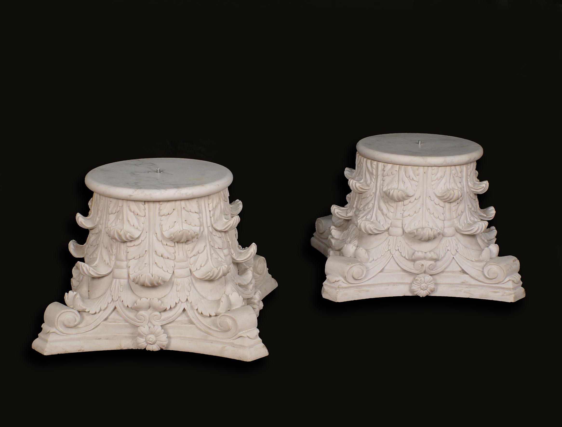 TAVOLINO BASSO DA SALOTTO manifattura recente piano rettangolare in cristallo molato poggiante su due capitelli in marmo bianco 44x180x90 cm.
