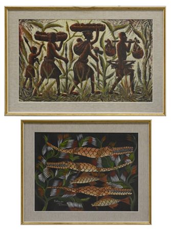 Lotto composto da due dipinti ad olio su tavola raffiguranti rispettivamente figure e coccodrilli. Uno firmato Mwenze e l'altro Kabunda