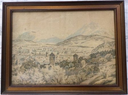 Arazzo meccanico in cornice raffigurante paesaggio con veduta panoramica su città. Fine XIX secolo. (Lievi difetti) (cm 43x32)
