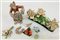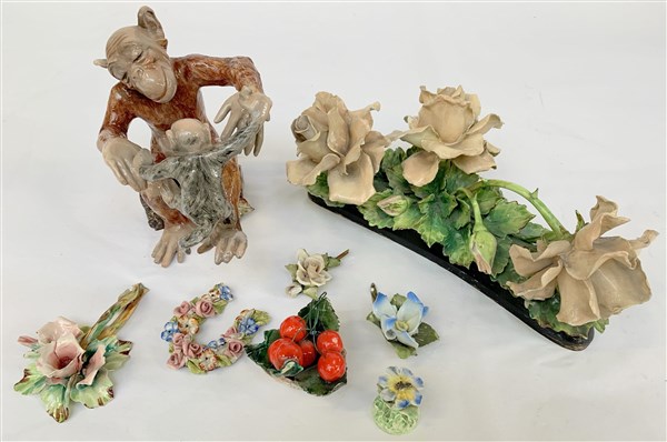 Lotto coposto da una scultura raffigurante due scimmie giocose, un centrotavola a cespo di rose, e sei piccole composizioni con fiori e frutti, tutti in ceramica policroma (difetti)