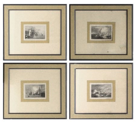 Gruppo di quattro litografie raffiguranti velieri (cm 10x14) in cornici laccate (difetti)