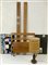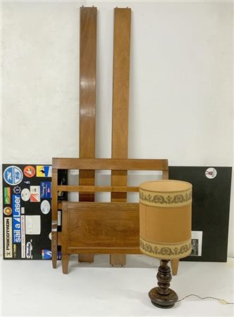 Lotto composto da un lettino con testata a giorno, una lampada da tavolo in legno con fusto tornito e due pannelli in legno (difetti)