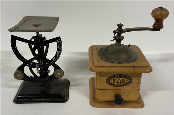 Lotto composto da una bilancia Original Columbus e un macinino da caffè F.B. Ma