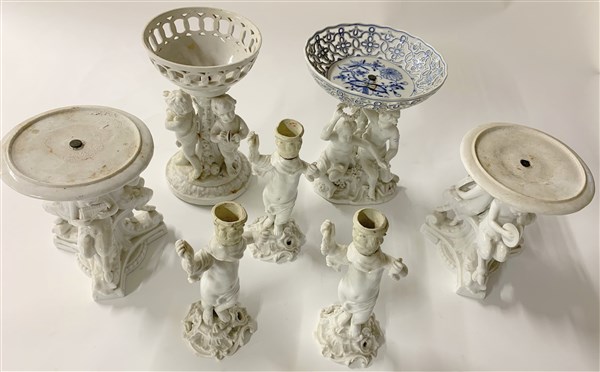 Manifatture diverse, lotto composto da quattro alzatine e tre candelieri ad una fiamma in porcellana con fusti decorati da putti a tutto tondo, alcuni marchiati Maissen (h max cm 25) (restauri e mancanze)