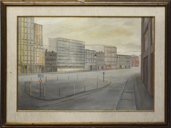 Enzo Di Guida (Napoli 1914 - MIlano 1972) "Milano, Via Pantano" 1970, olio su tavola (cm 70x100) Firmato in basso a sinistra. Al retro: timbro dell'artista, firmato, datato e titolato Timbro dell'Esposizione Palazzo dell'Ex Arengario 1 dicembre 1972. In cornice
