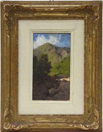 "Paesaggio montano" olio su tavola (cm 18.5x11) Firmato in basso a destra.AL retro: firmato; cartiglio del centro d'Arte di Vicenza. In cornice