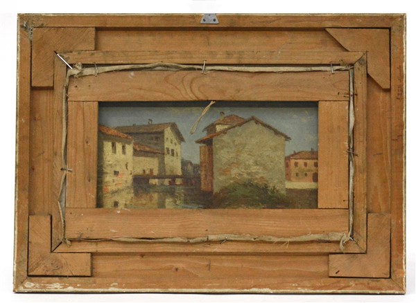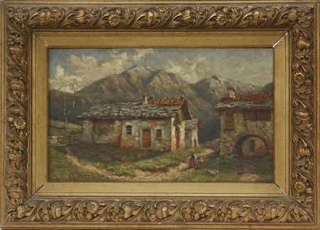 "Paese di montagna" olio su tela (cm 28x45) Firmato in basso a sinistra.Al retro: bozzetto con paesaggio fluviale, firmato e locato Dizzasco d'Intelvi. In cornice