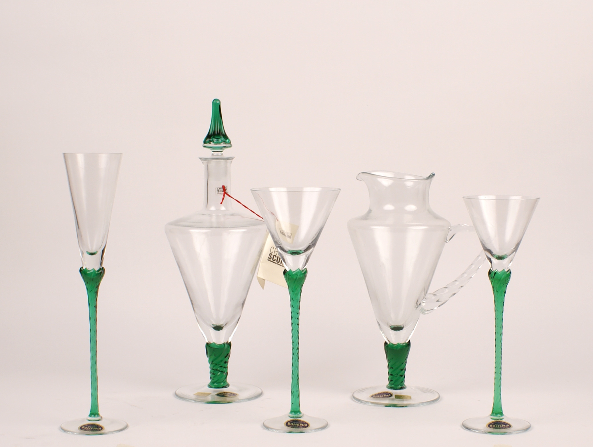 SERVIZIO DI BICCHIERI IN CRISTALLO TRASPARENTE CON STELO VERDE Boemia vecchia...