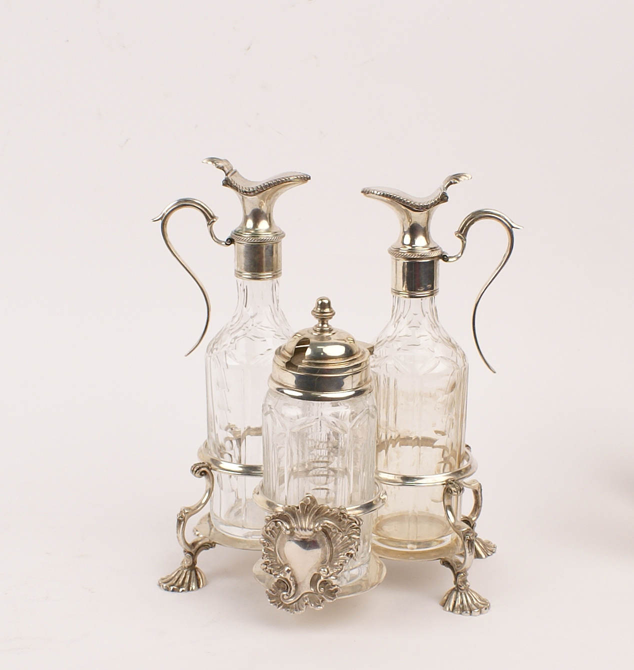 OLIERA IN ARGENTO CON TRE AMPOLLE IN CRISTALLO Firenze vecchia manifattura base sagomata con cartiglio centrale poggiante su piedini a foggia di conchiglia, manico a voluta, cm. 21x16x14 350 gr.