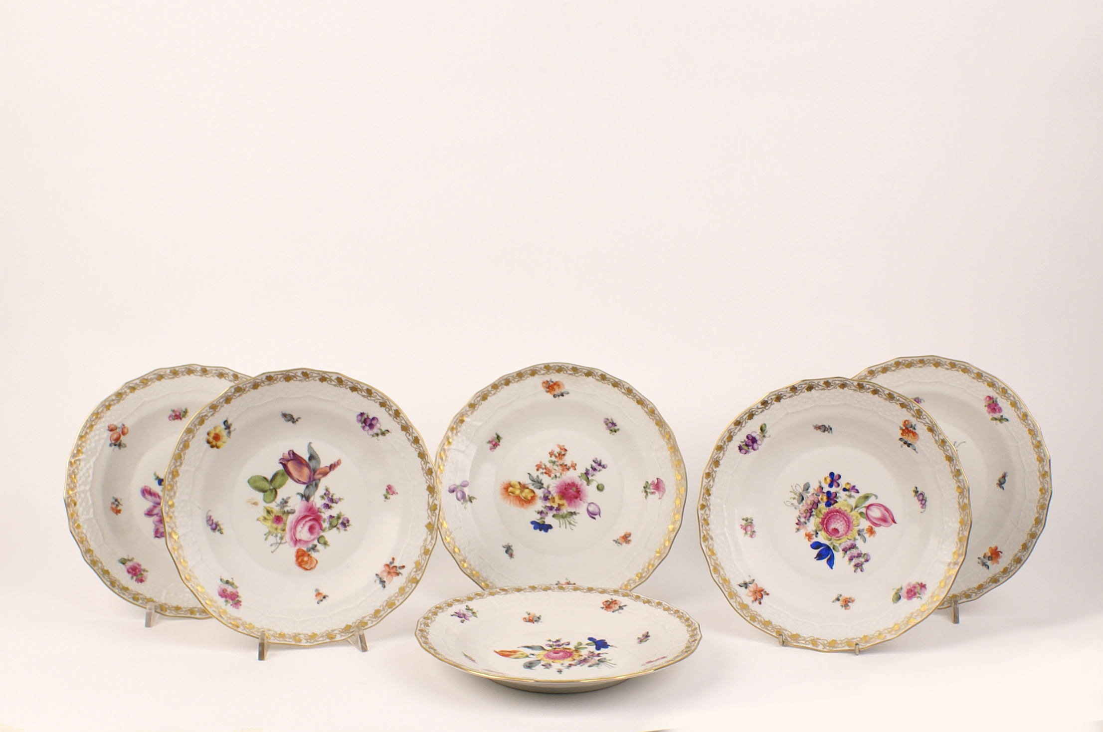 SEI PIATTI IN PORCELLANA BIANCA E PROFILATA ORO manifattura Herend, anni...