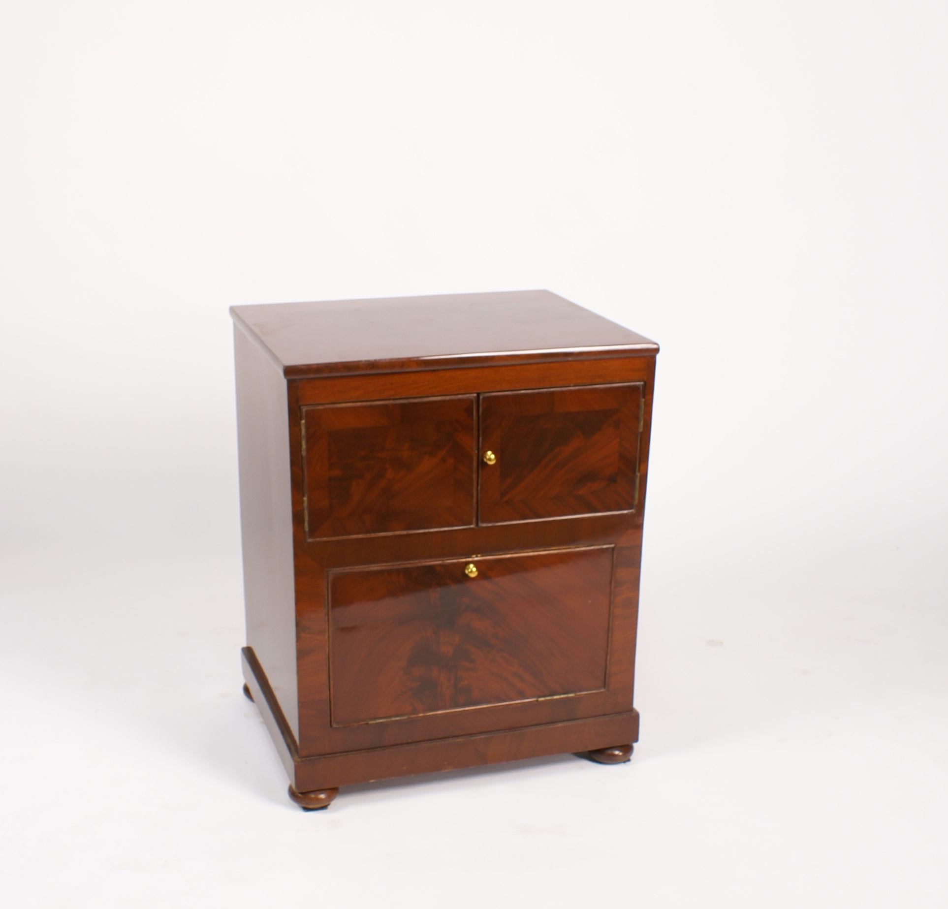 PICCOLO MOBILE BAR Inghilterra XIX Sec. in mogano e piuma di mogano, piano rettangolare, fronte a tre sportelli dim. 71x58x47 cm.