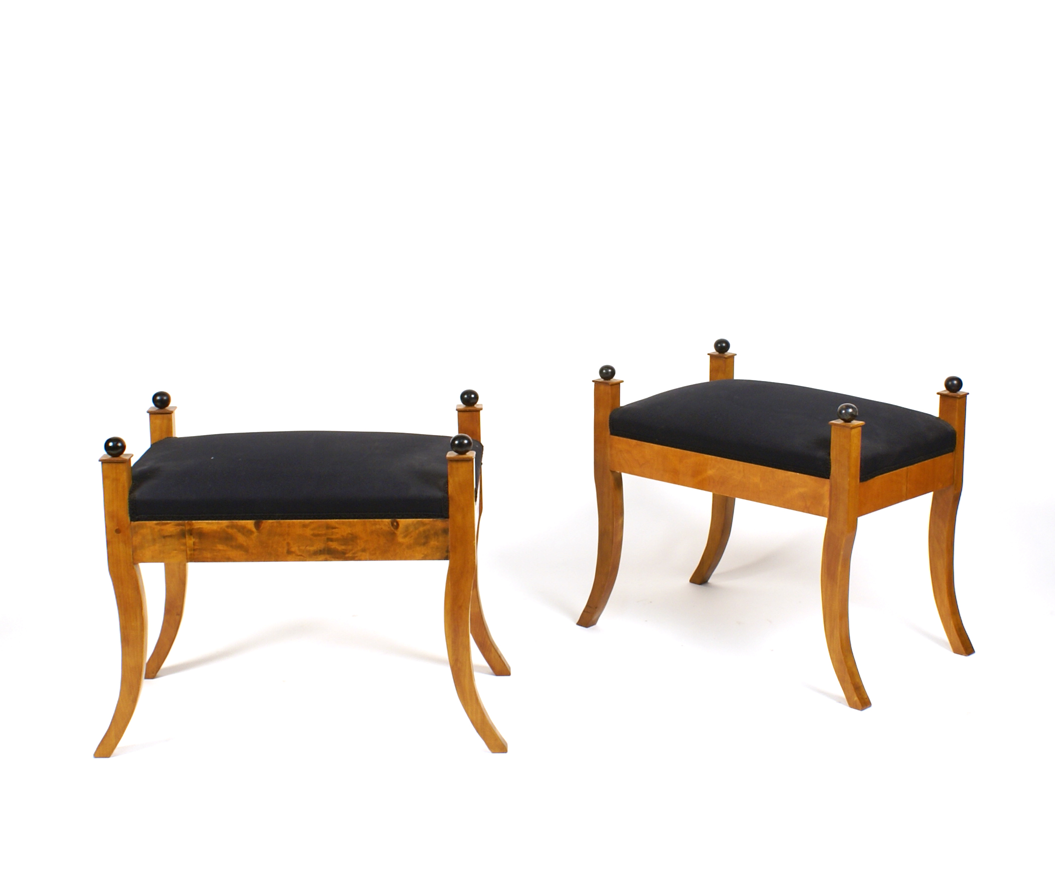COPPIA DI SGABELLI BIEDERMEIER vecchia manifattura in betulla, sedute imbottite e rivestite in tessuto delimitate da sfere in legno ebanizzato 56x61x40 cm.