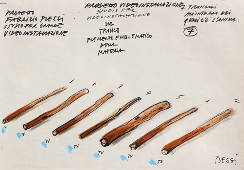 Fabrizio PLESSI Reggio Emilia 1940 Progetto per grande video installazione Tecnica mista su carta cm 21 X 29.5 Bibliografia ‘Fabrizio Plessi. Movimenti della memoria’, Kistefos – Museet, Silvana Editoriale, 2005, ill. Titolo ‘Progetto per grande video installazione’ (in alto a sinistra); Firma ‘Plessi’ (in basso a destra)