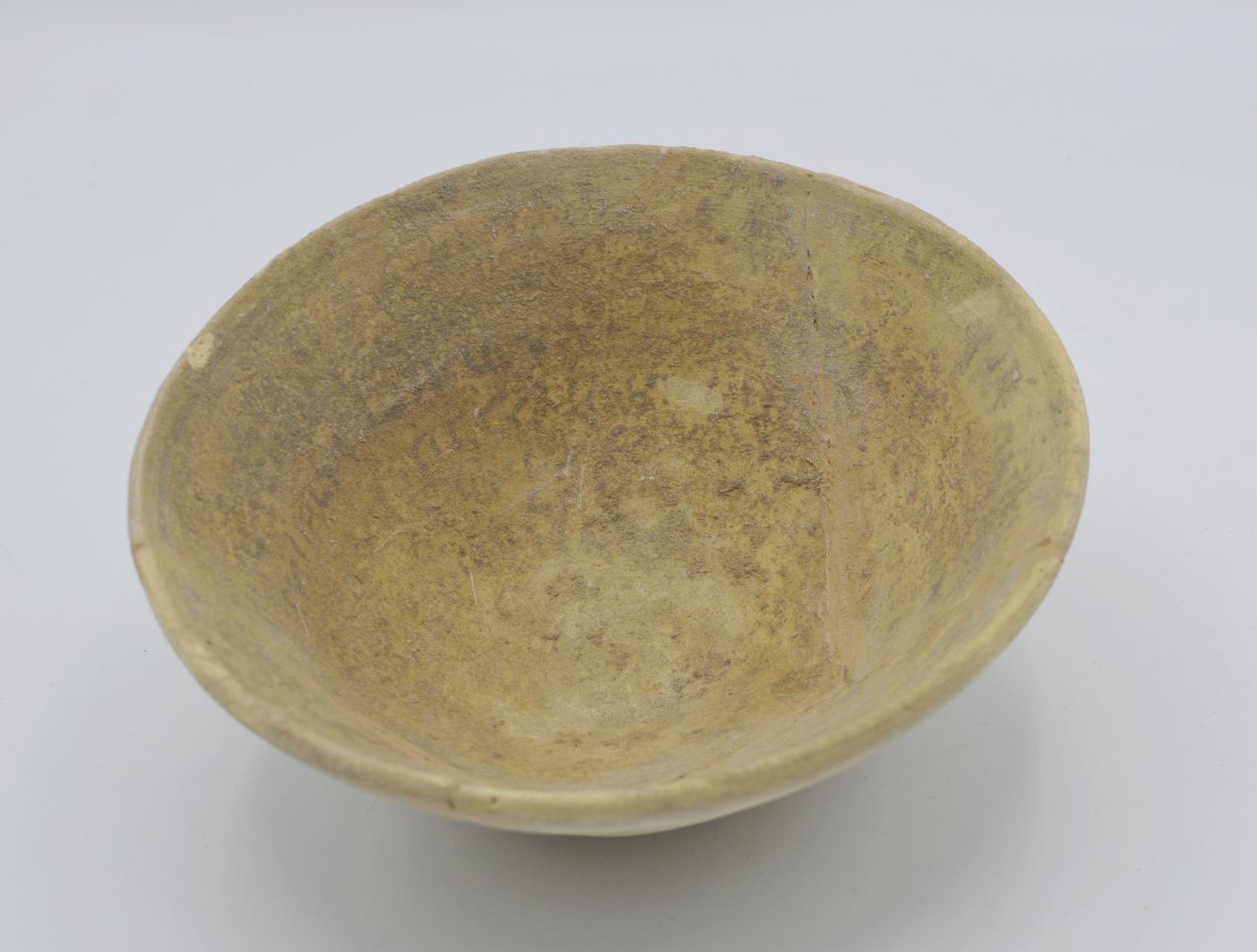 Coppa troncoconica con labbro arrotondato e fondo convesso; la parte interna della vasca è quasi completamente occupata da una lunga iscrizione in inchiostro nero