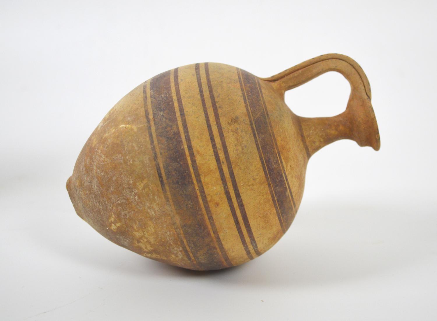 Brocchetta con bocca ad echino rovescio, alto collo cilindrico a profilo concavo, corpo ovoide rastremato verso il basso, fondo piatto; ansa a nastro con margini rilevati, decorata sul ventre a fasce e filetti paralleli.