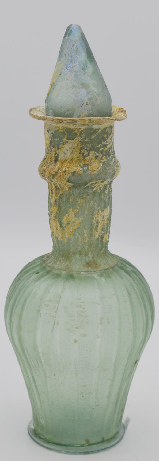Unguentario a bottiglia con bocchello appiattito, lungo collo cilindrico con nervature verticali rilevate, distinto dal corpo ovoide, piede a disco; tappo in vetro biconico.