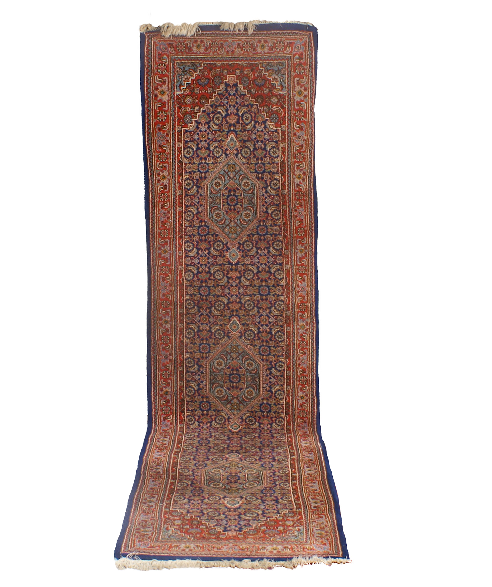 TAPPETO GUIDA manifattura orientale disegno geometrico su fondo blu e rosso 320x78 cm.