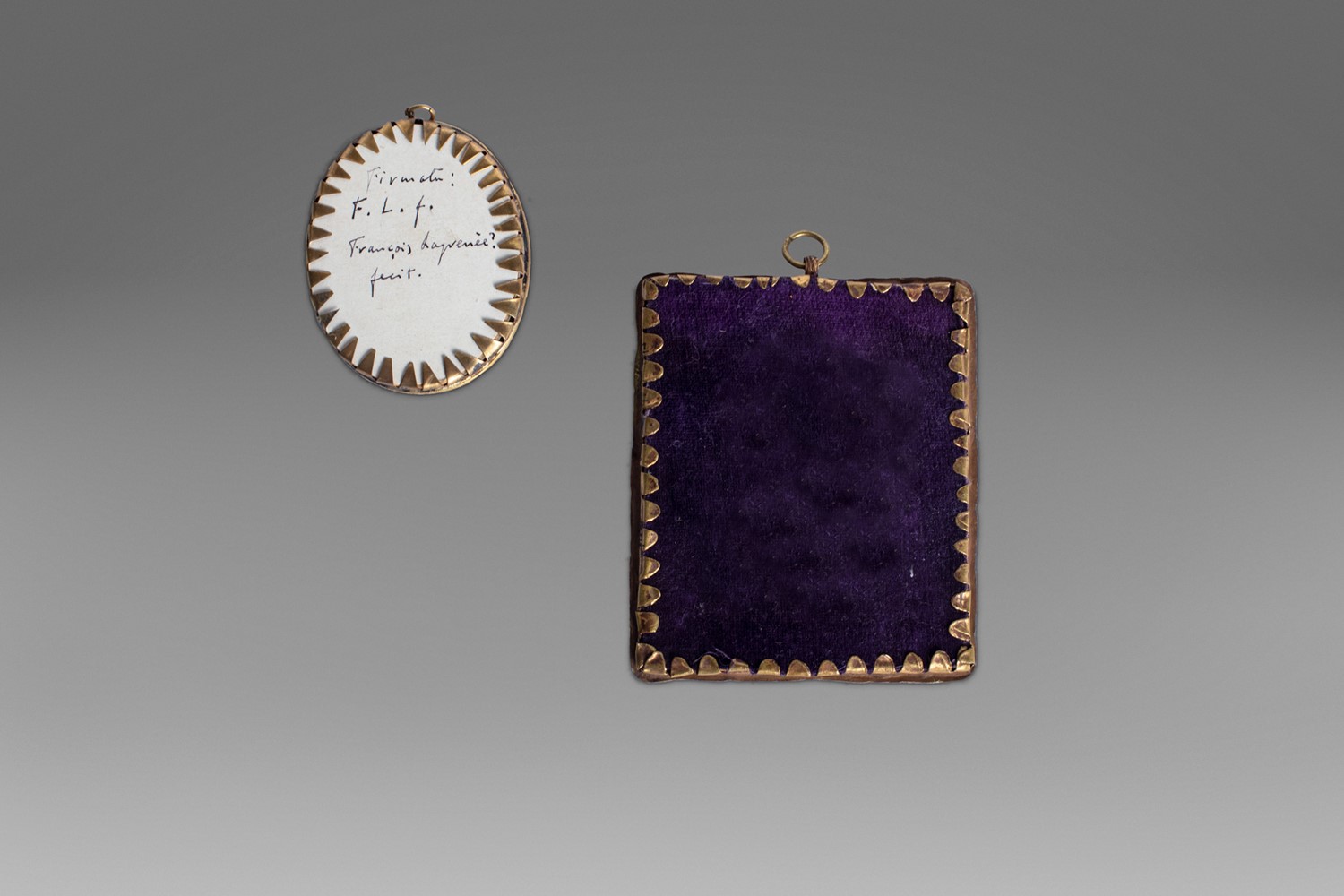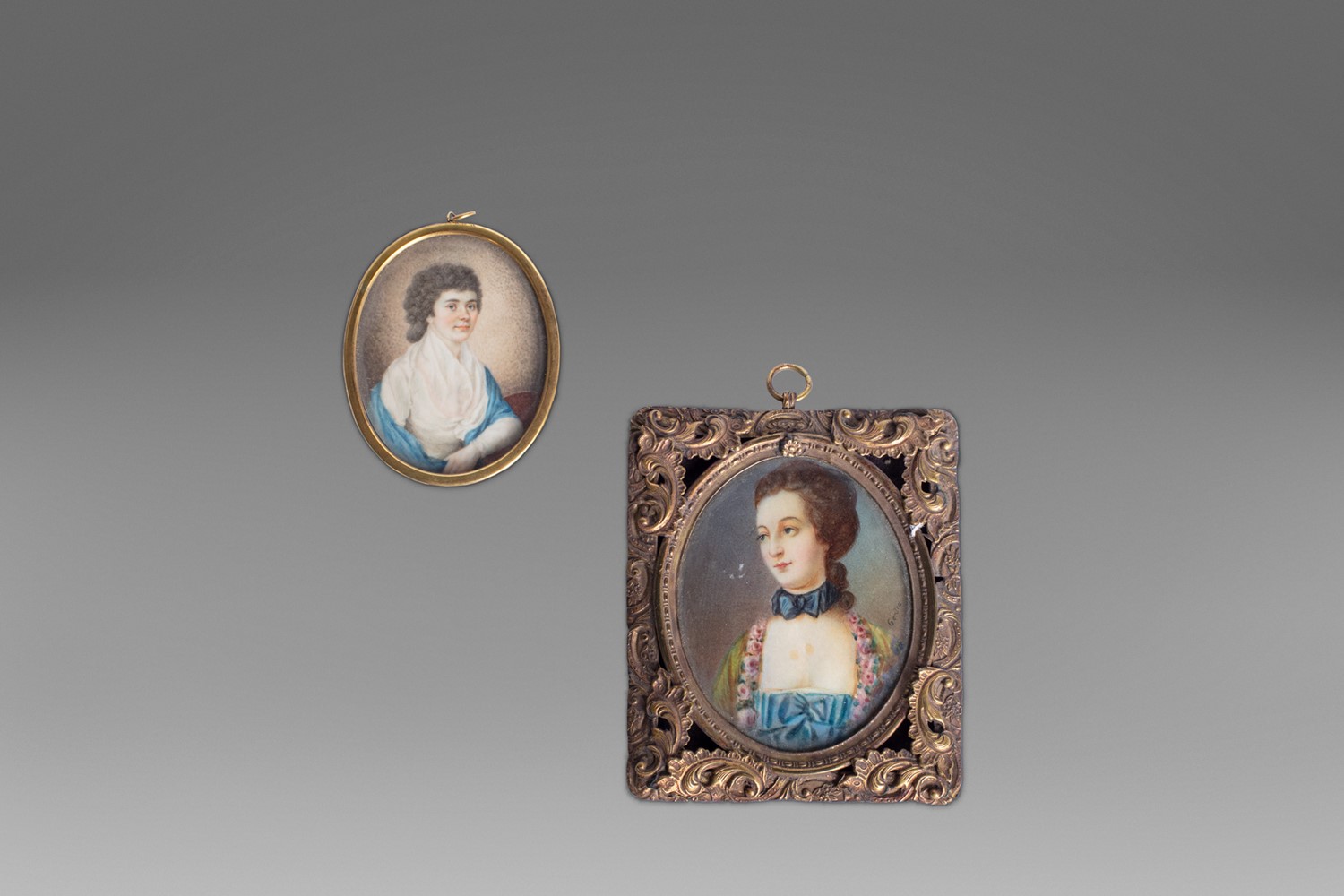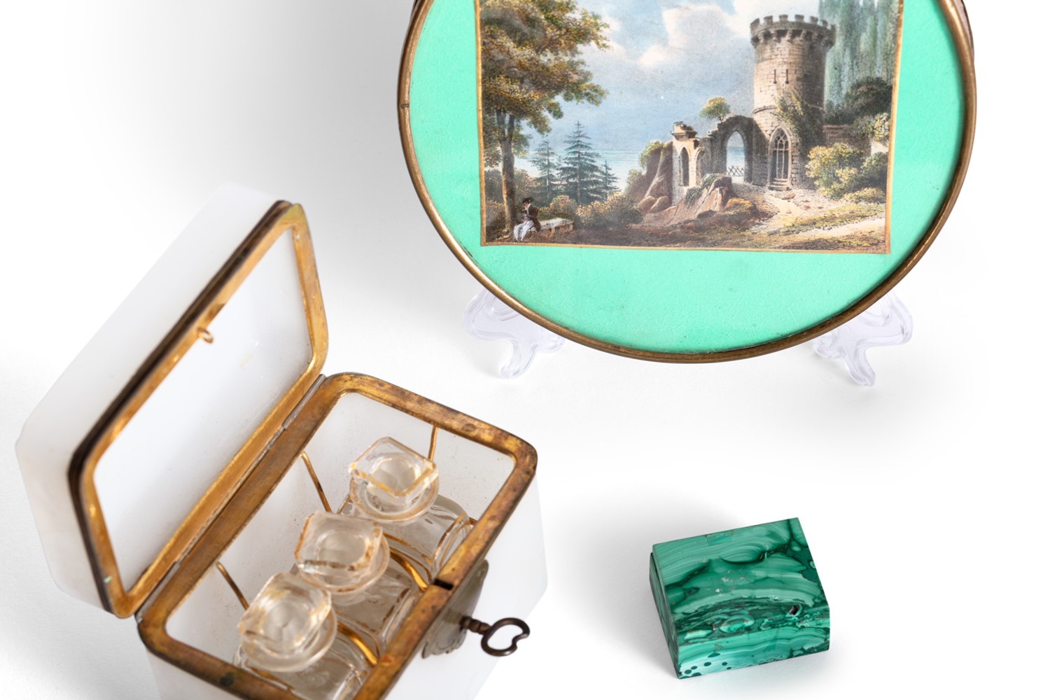 composto da un contenitore in opalina con tre flaconcini all'interno, una coppa con coperchio in metallo dorato, una scatolina in metallo e coperchio in cristallo, una scatolina ovale in tartaruga e profili in metallo dorato, una scatola circolare con stampa con rovine gotiche sul coperchio, una scatola in cartone con stampa raffigurante scena familiare sul coperchio, una chiave in bronzo dorato, una scatolina in malachite, una miniatura ovale raffigurante ritratto di gentildonna, secolo XIX, una miniatura rettangolare raffigurante ritratto di gentildonna con papillon azzurro, inizi secolo XX.composto da un contenitore in opalina con tre flaconcini all'interno, una coppa con coperchio in metallo dorato, una scatolina in metallo e coperchio in cristallo, una scatolina ovale in tartaruga e profili in metallo dorato, una scatola circolare con stampa con rovine gotiche sul coperchio, una scatola in cartone con stampa raffigurante scena familiare sul coperchio, una chiave in bronzo dorato, una scatolina in malachite, una miniatura ovale raffigurante ritratto di gentildonna, secolo XIX, una miniatura rettangolare raffigurante ritratto di gentildonna con papillon azzurro, inizi secolo XX.