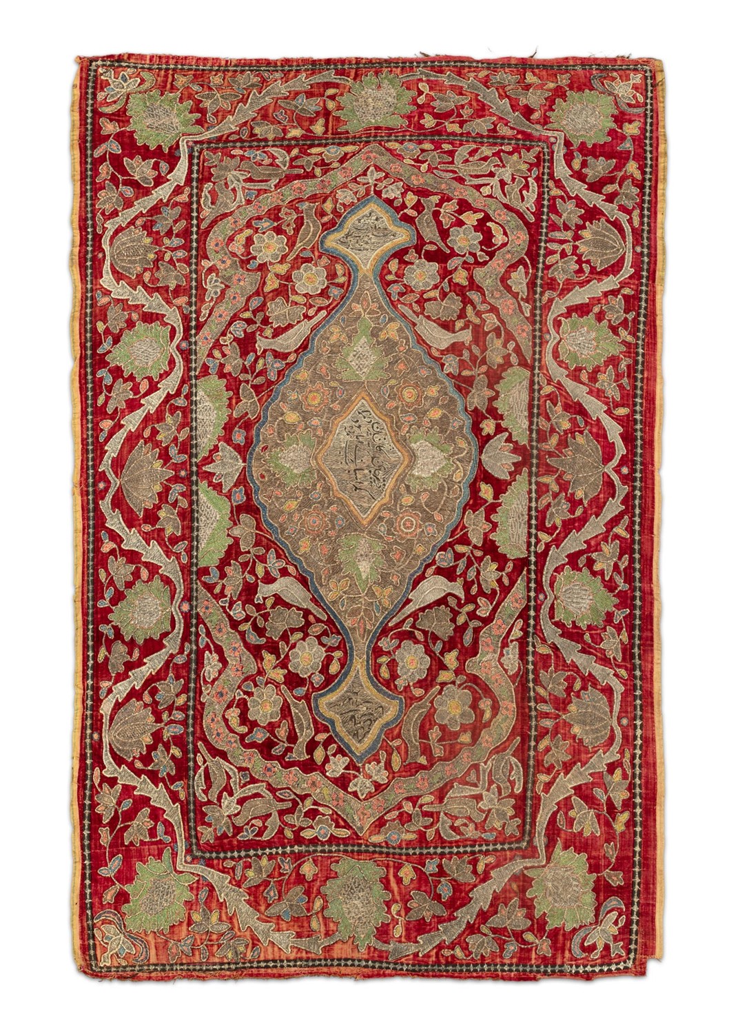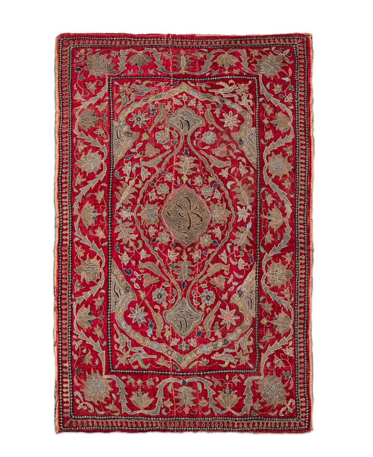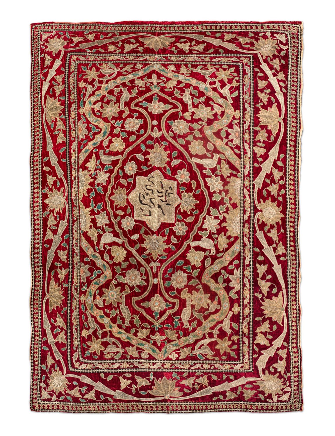 Tre antichi tessuti ricamati con fili di seta e d'argento su fondo di velluto rosso, Medio Oriente