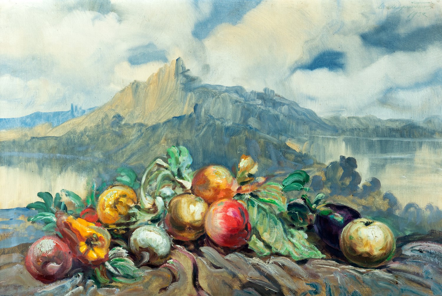 Antonio Calcagnadoro (Rieti 1935-1976) - Natura morta con montagna e lago sullo sfondo, 1932