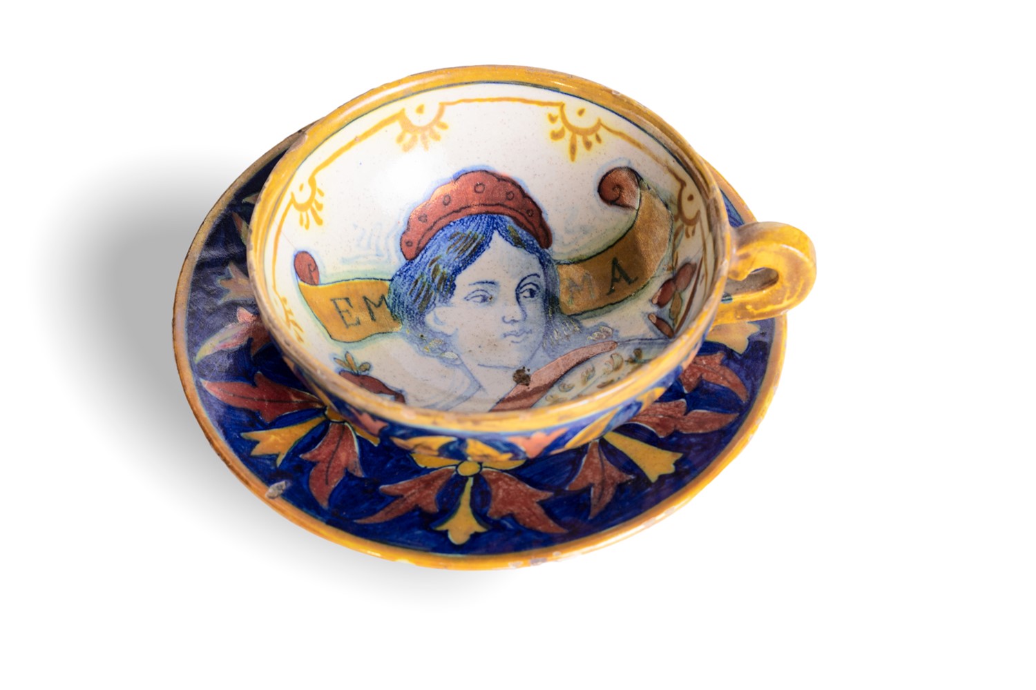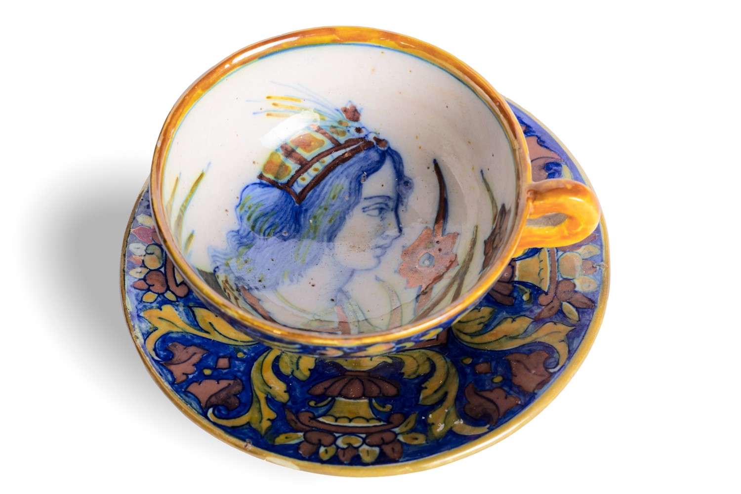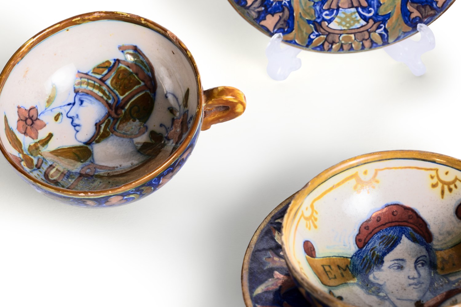 marca sotto la base AS intrecciate (Alfredo Santarelli), composto da tre tazzine e tre piattini, due con decorazioni policrome con profilo di donna e una con profilo di guerriero.marca sotto la base AS intrecciate (Alfredo Santarelli), composto da tre tazzine e tre piattini, due con decorazioni policrome con profilo di donna e una con profilo di guerriero.