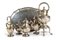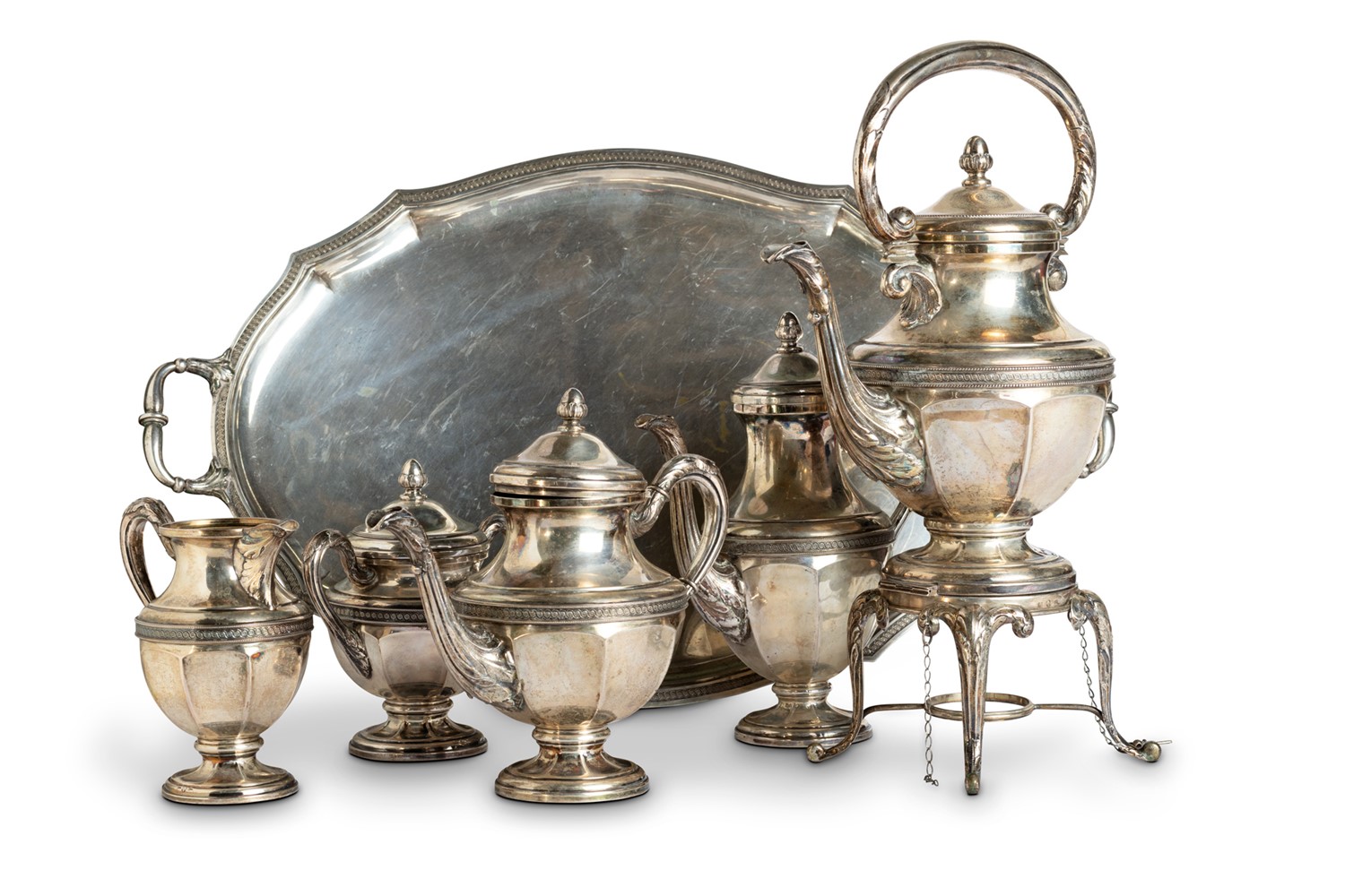 composto da 6 pezzi: una teiera su samovar, una teiera più piccola, una caffettiera, una lattiera, una zuccheriera e il vassoio