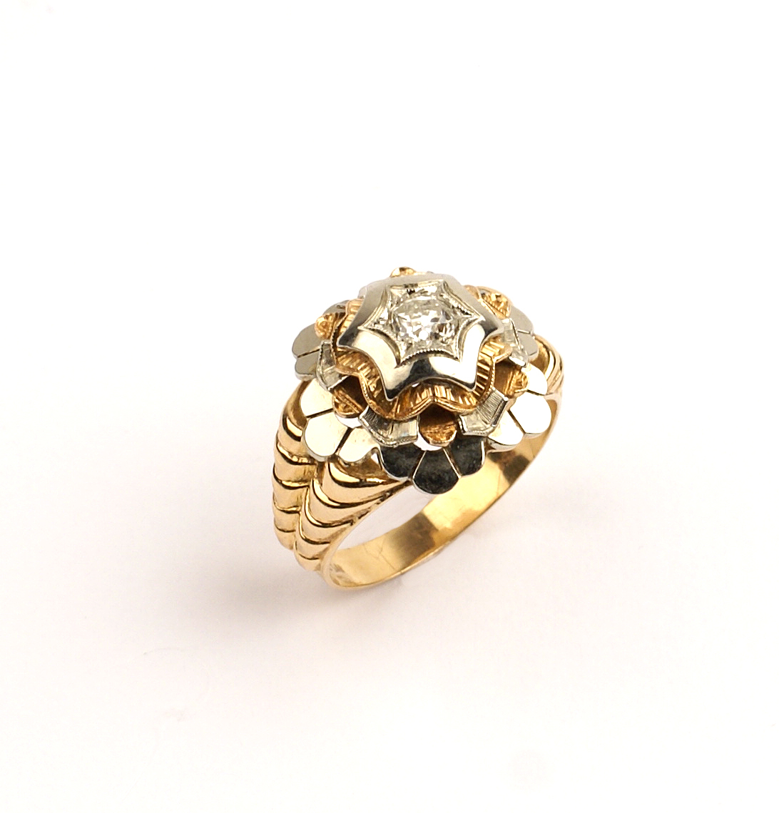 ANELLO A MOTIVO FLOREALE in oro rosso e bianco 18kt con al centro un diamante taglio brillante vecchio per 0,35 punti circa, misura 22
