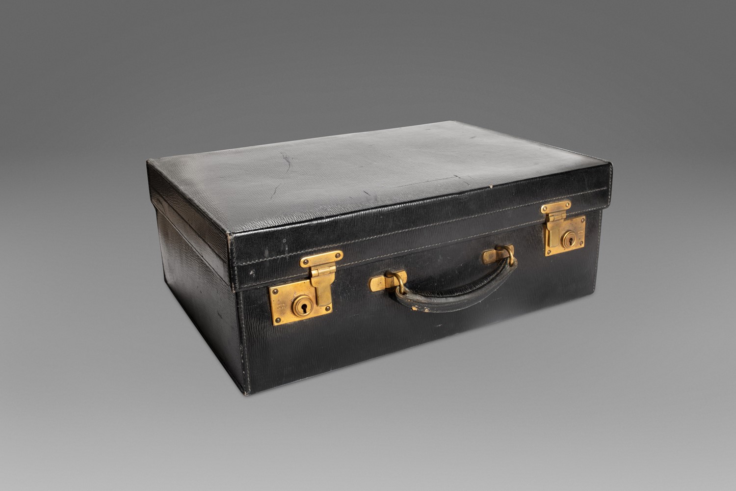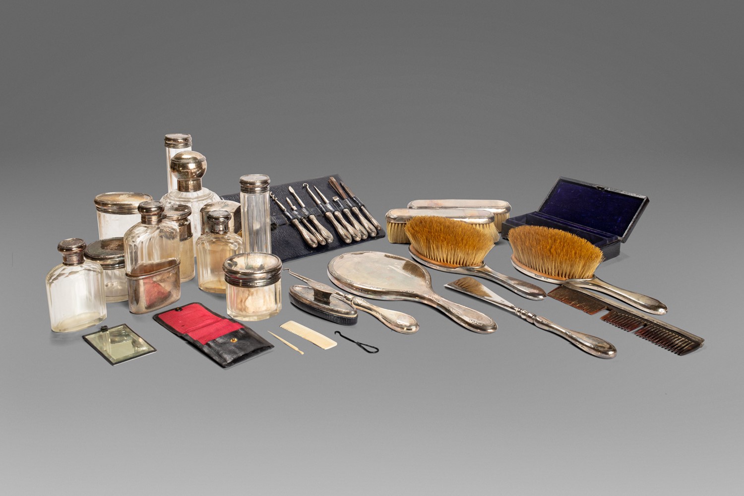 Servizio da toeletta in argento e cristallo, in valigia di cuoio nero, firmato Mappin e Webb London