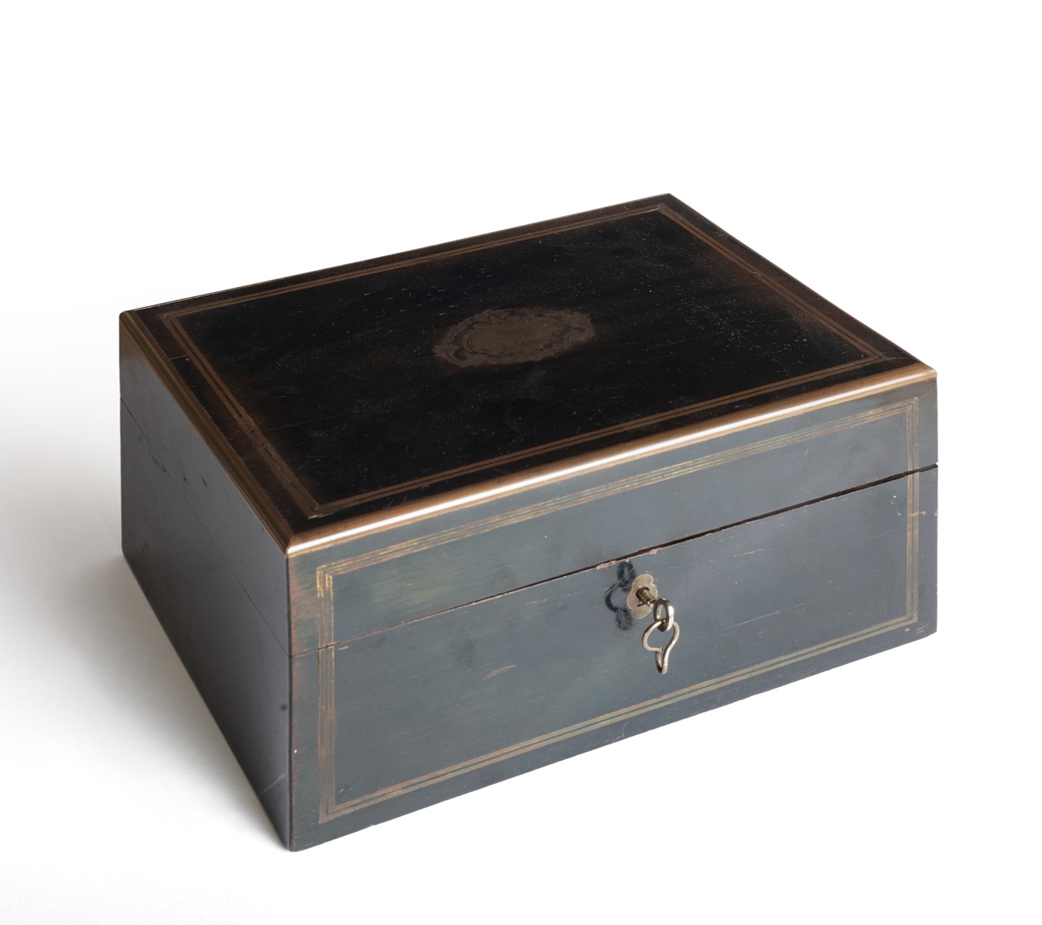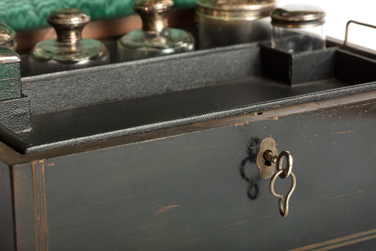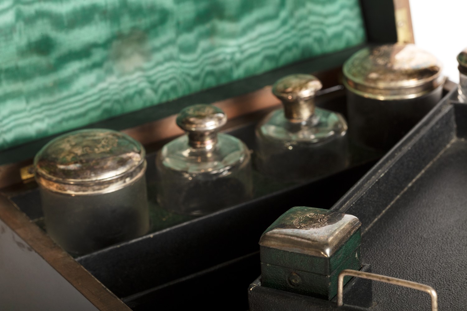 Set da viaggio ebanizzato nero con profili in ottone, all'interno flaconi in cristallo e argento