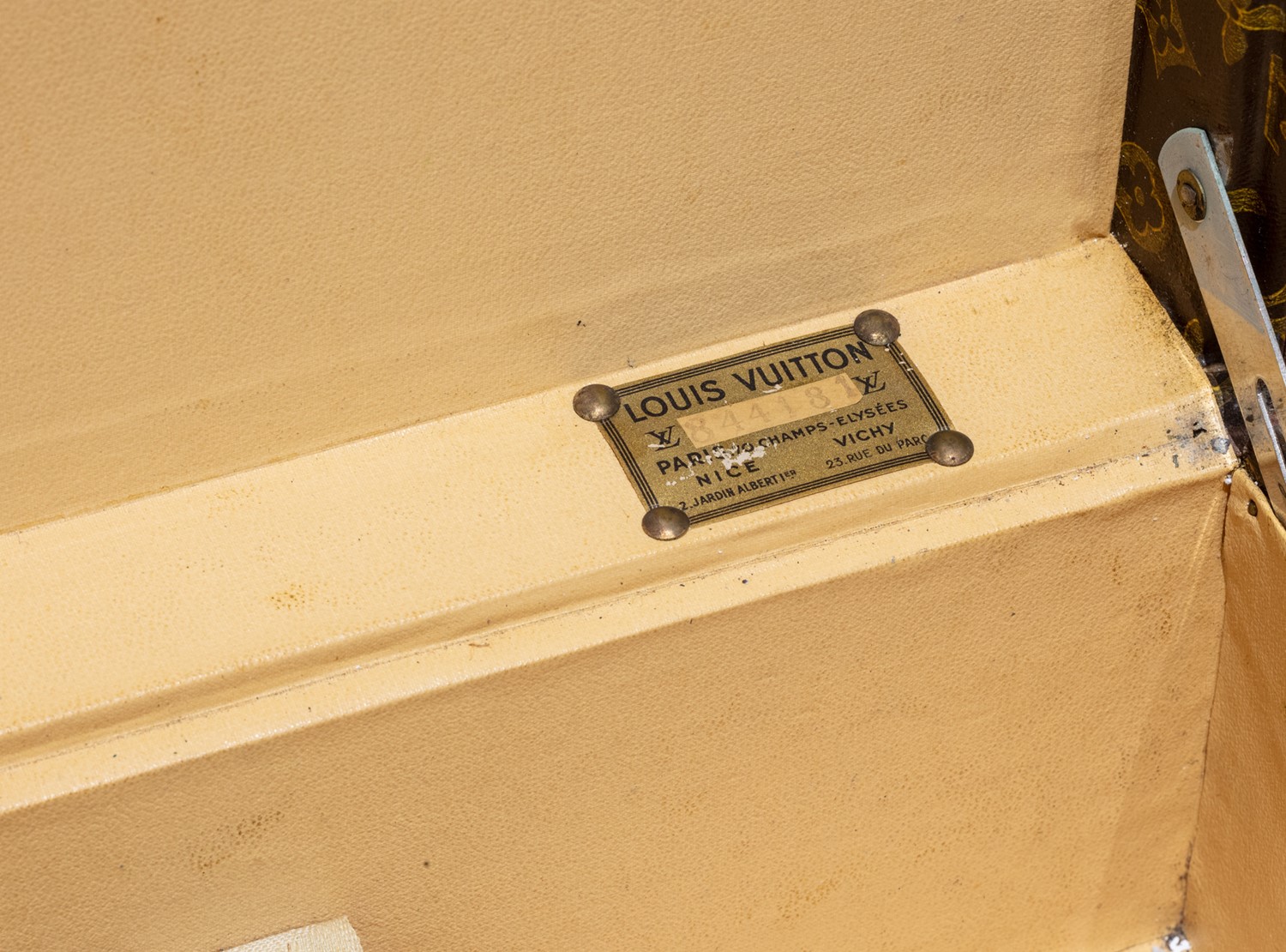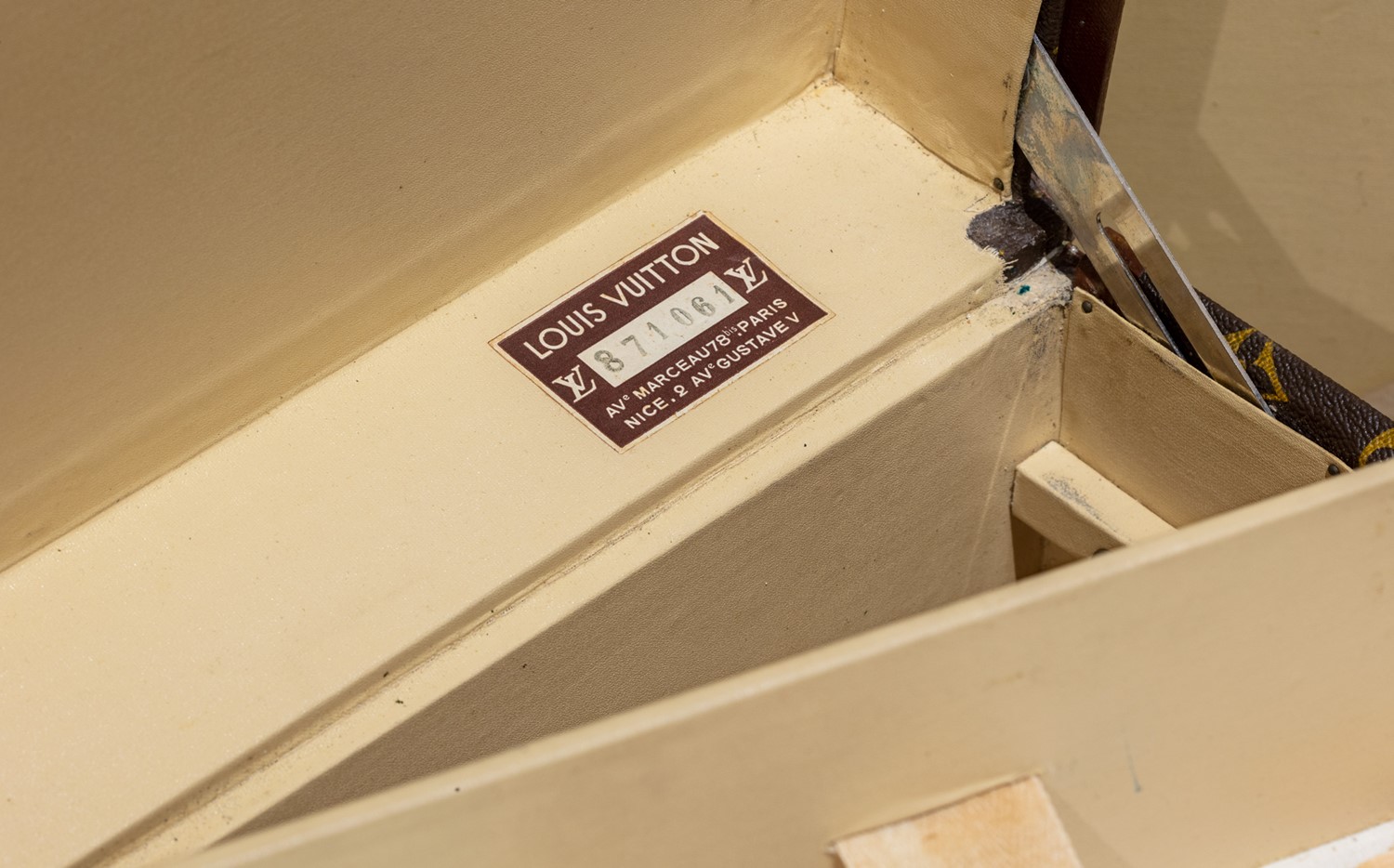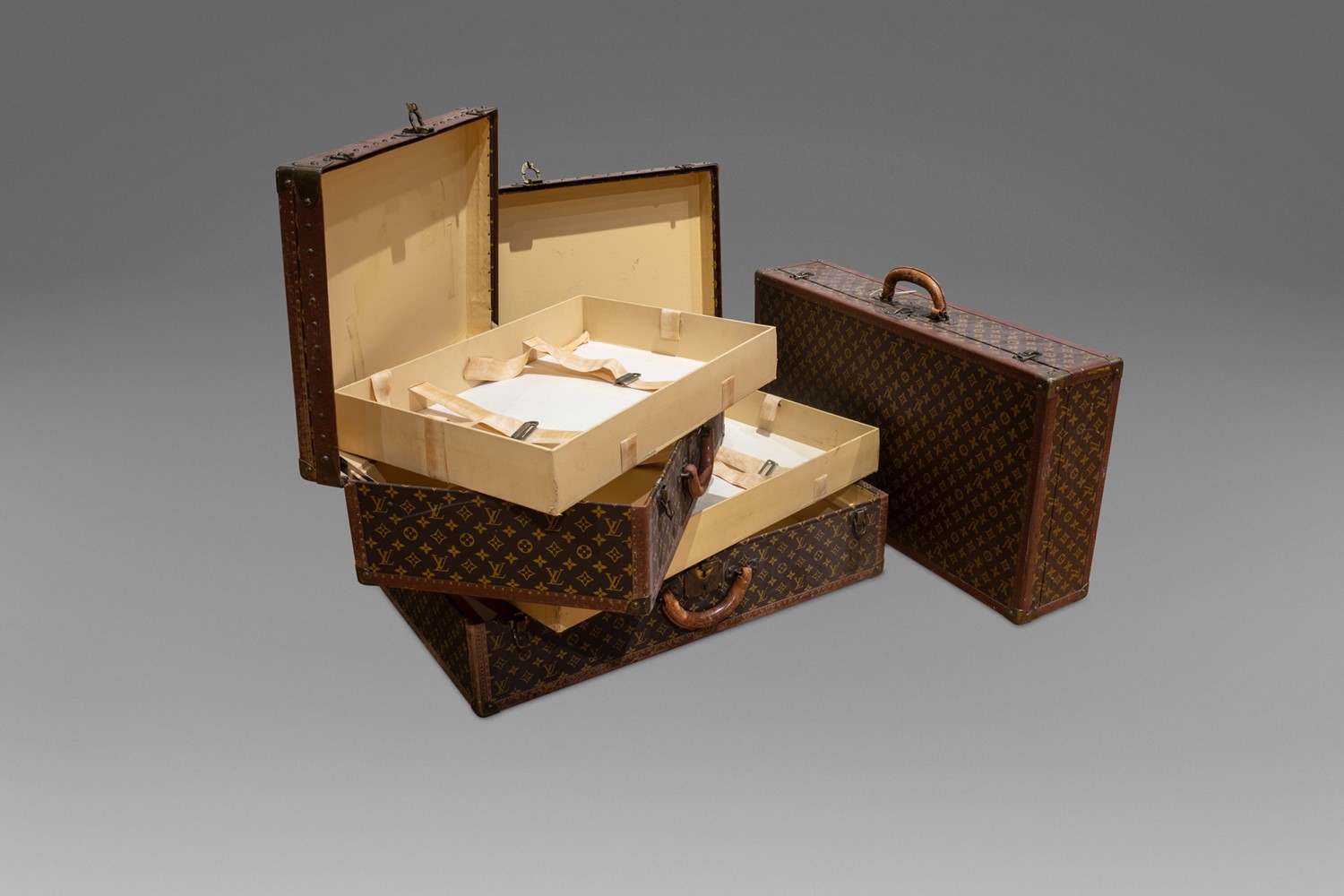 Louis Vuitton - Set di tre valigie in pelle logata di misure diverse, interno in tela con scomparti removibili (la più grande e la più piccola), finiture in pelle con dettagli in ottone, con chiavi