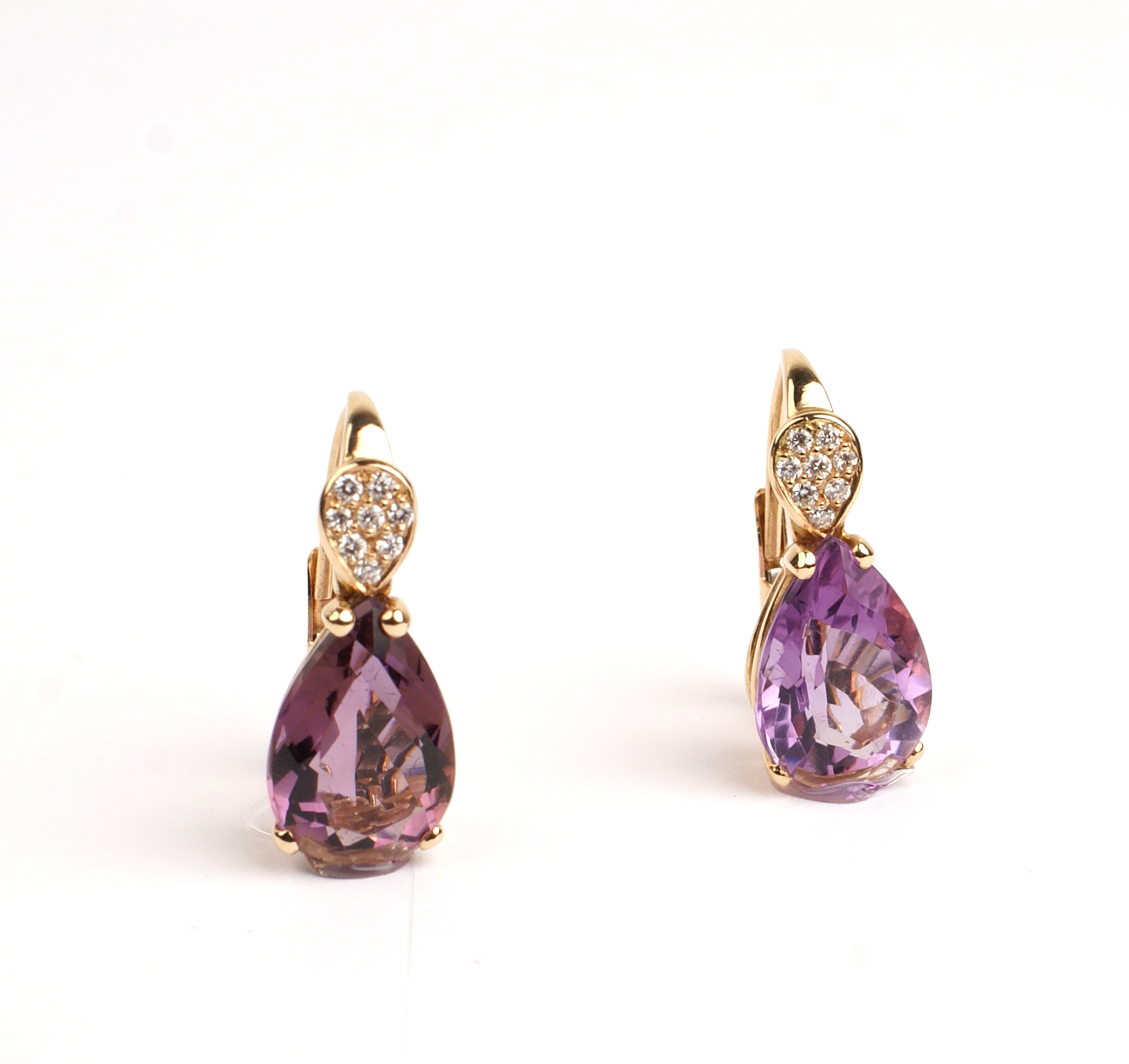 ORECCHINI A MONACHINA IN ORO ROSSO 18KT con due ametiste a goccia sormontate da diamanti taglio brillante per 0,15 punti circa 5,8 gr.