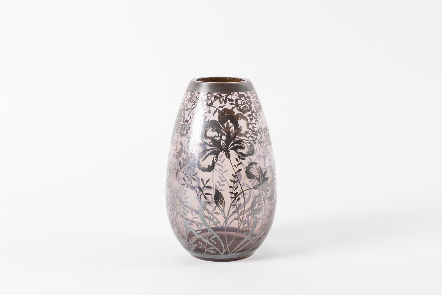 Vaso in vetro decorato con foglia d'argento a motivi floreali
