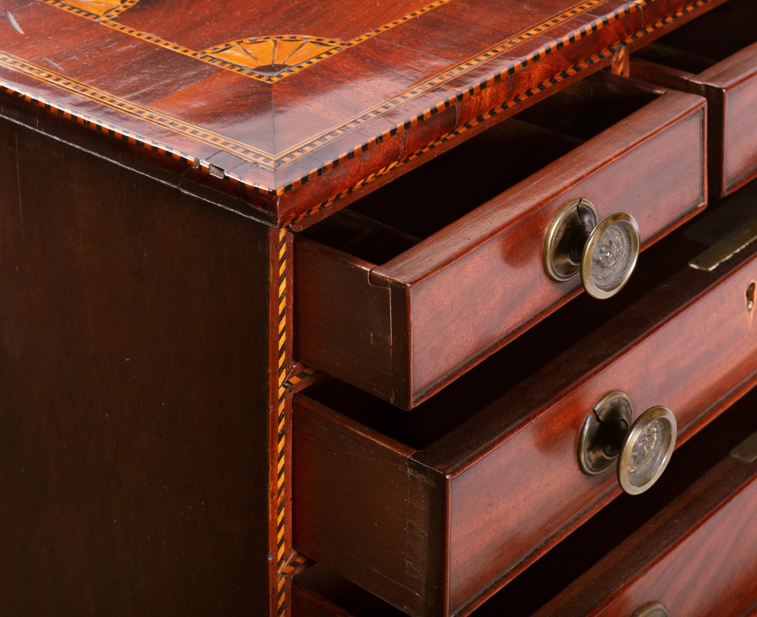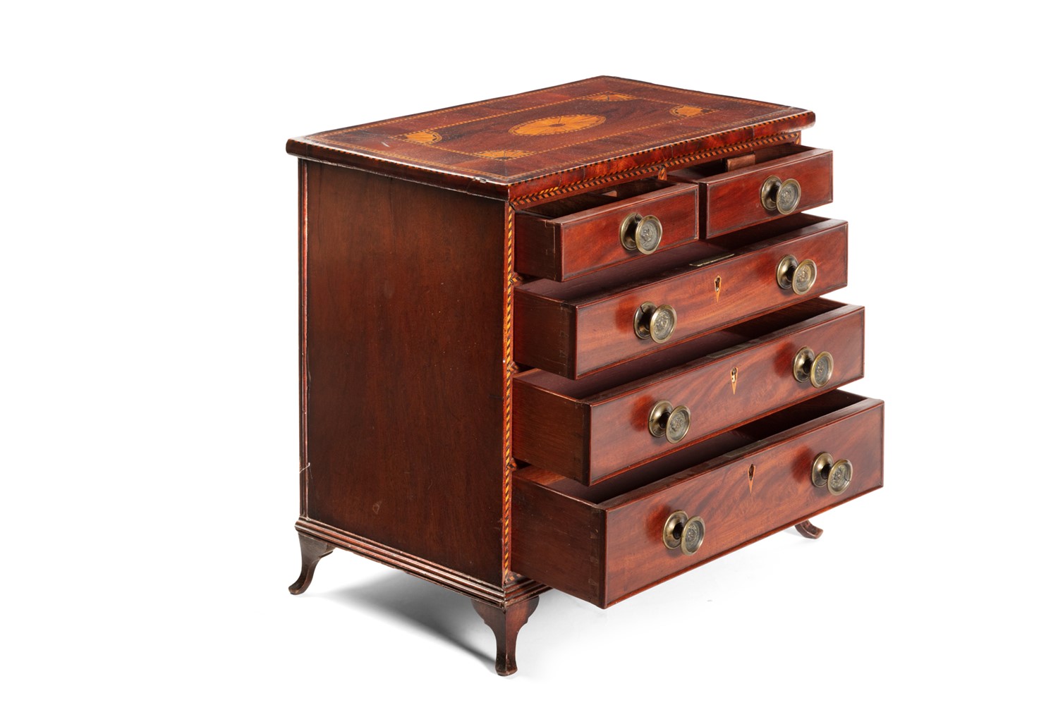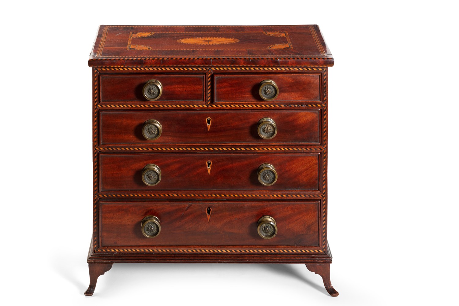Modellino di cassettone, Inghilterra, secolo XIX, con decori ad intarsio, cinque cassetti