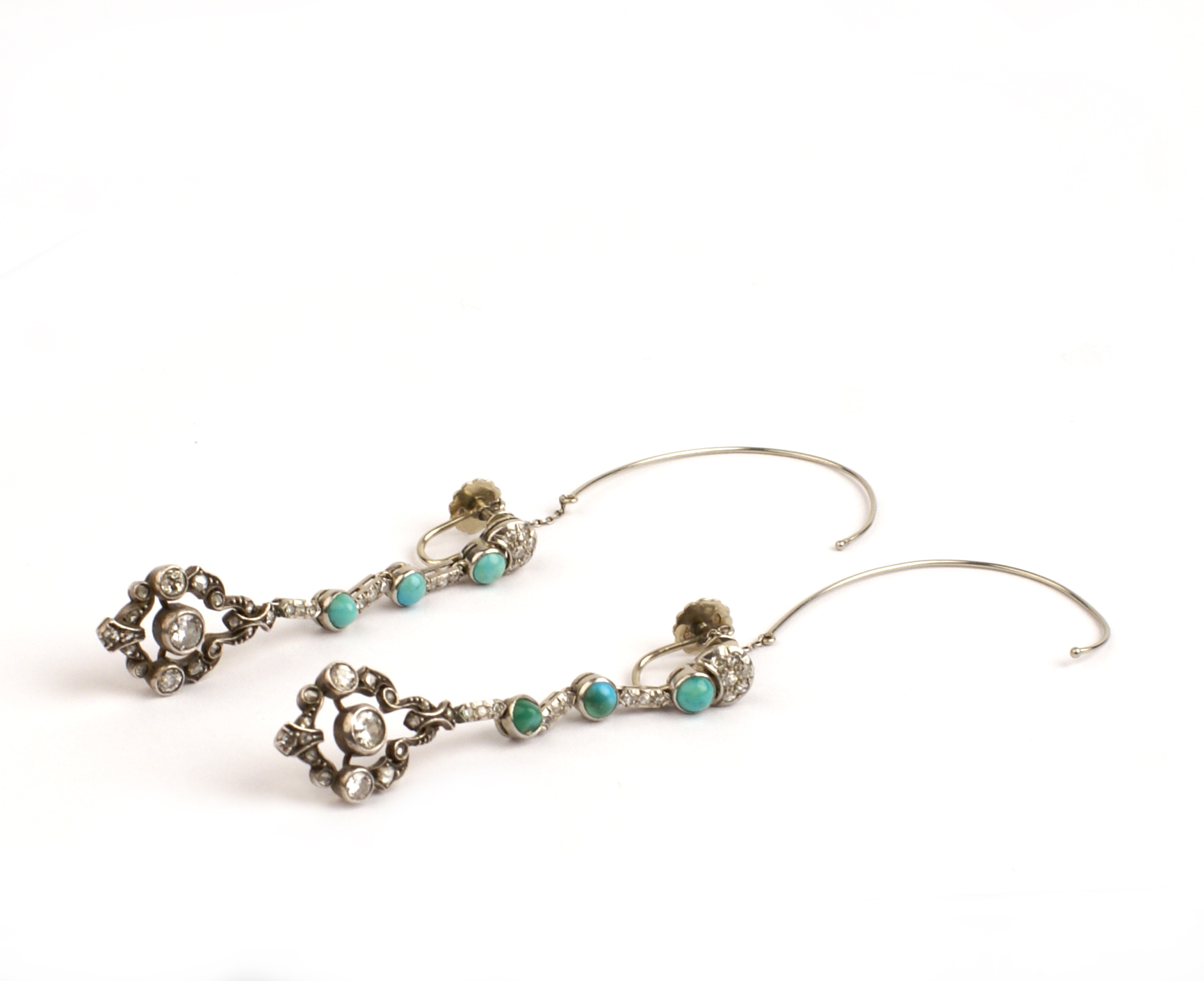 ORECCHINI PENDENTI primi 900 in oro bianco diamanti taglio vecchio per ct 1 circa e turchesi naturali (lievi difetti) 11,90 gr.