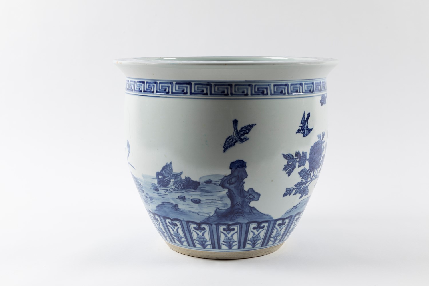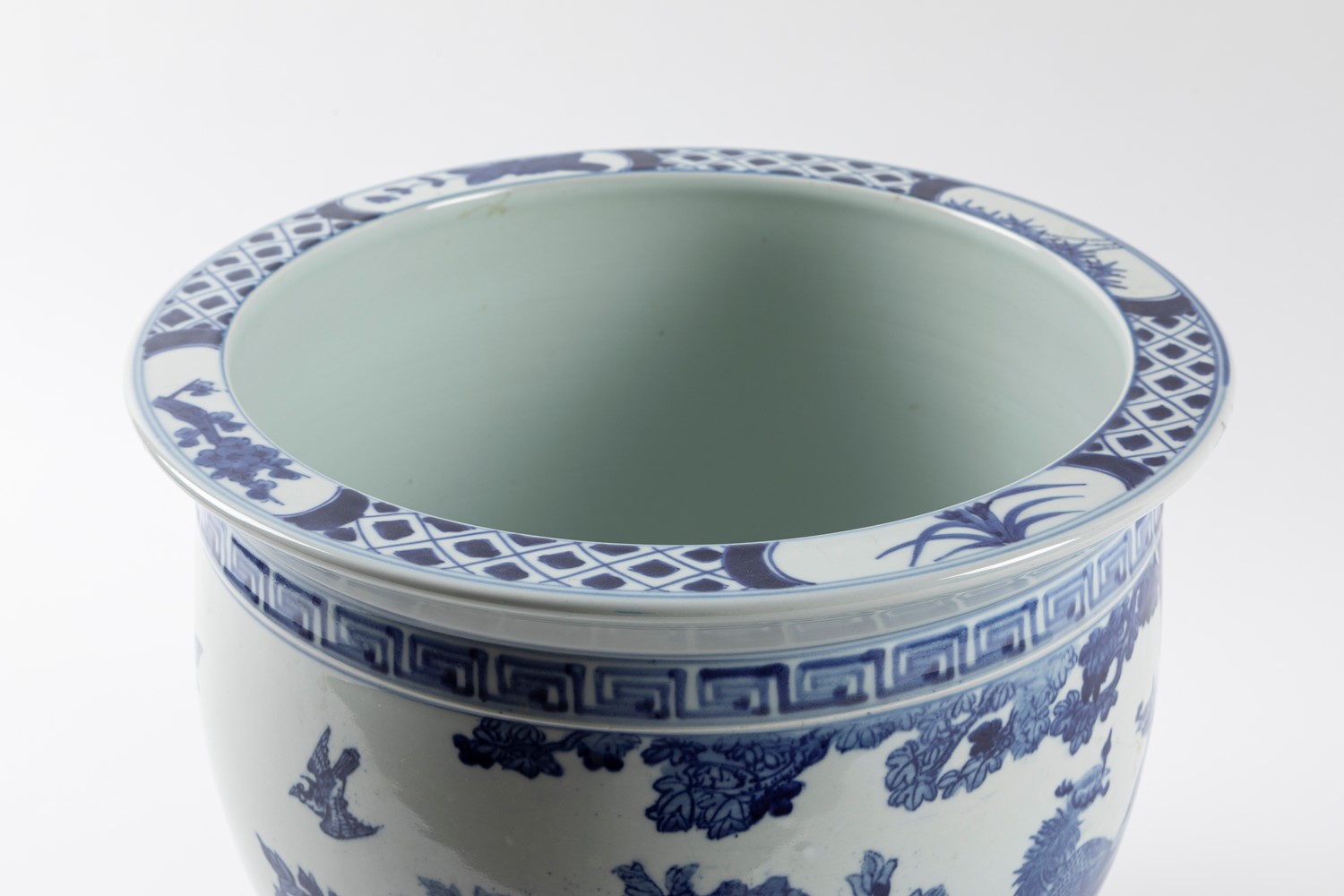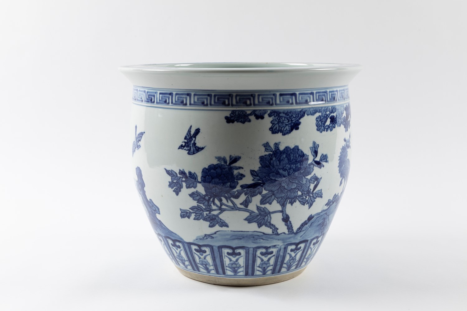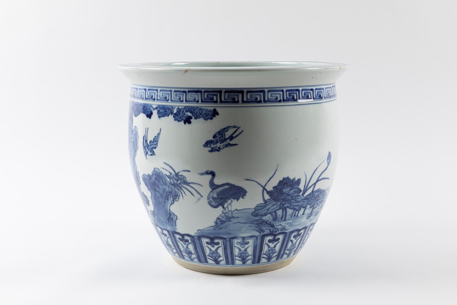 Grande cachepot in porcellana bianca e blu decorata con paesaggio e uccelli, Cina secolo XX