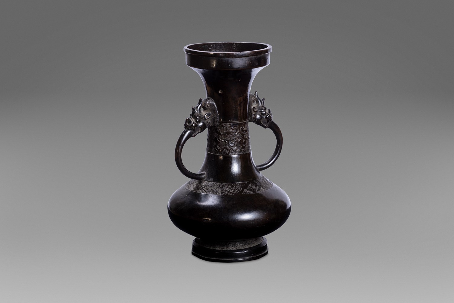 Vaso in bronzo biansato con teste di draghi e decoro geometrico, Cina secolo XIX