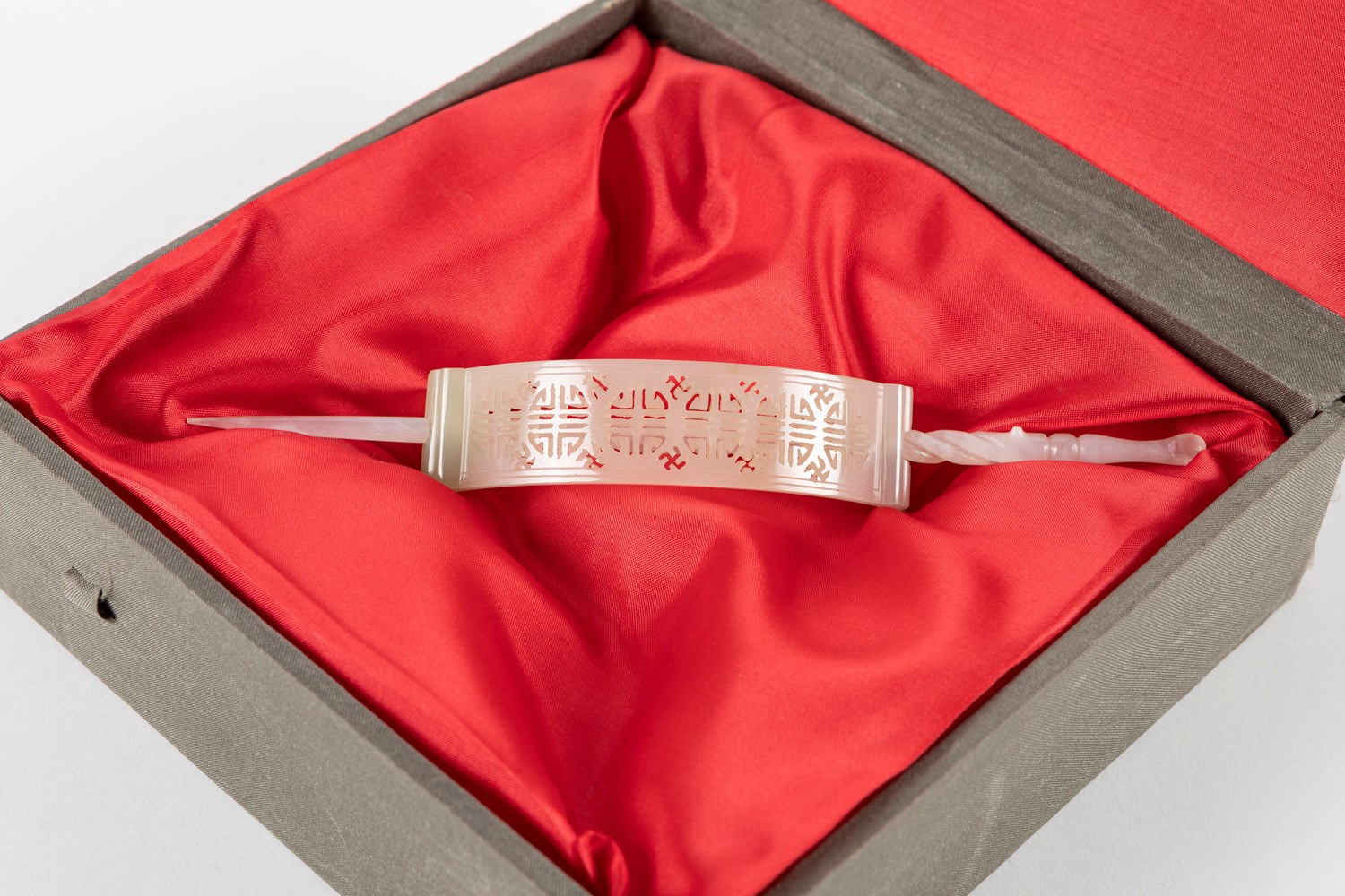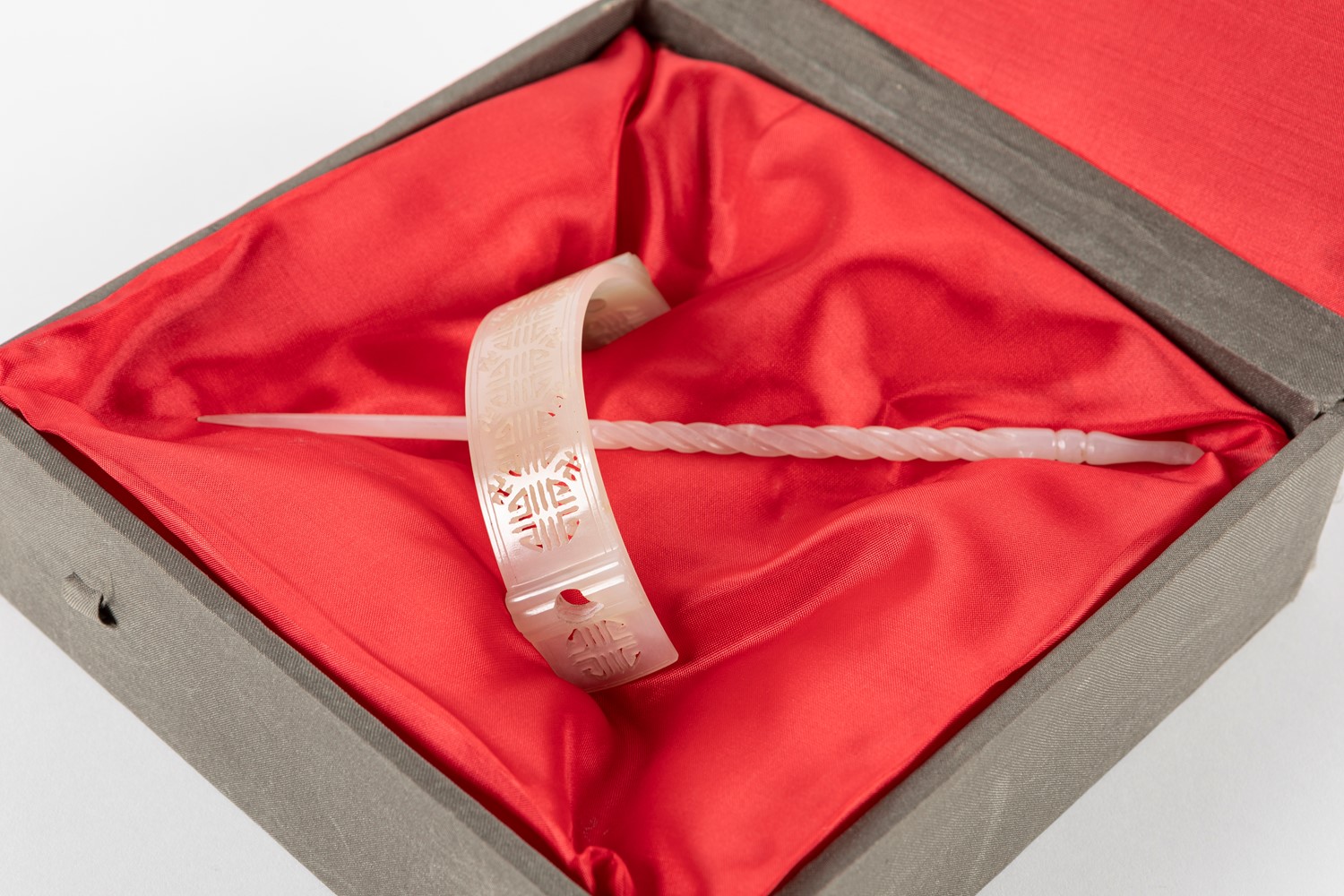 spillone lavorato a torchon e fermaglio a traforo con simboli di buon auspiciospillone lavorato a torchon e fermaglio a traforo con simboli di buon auspicio