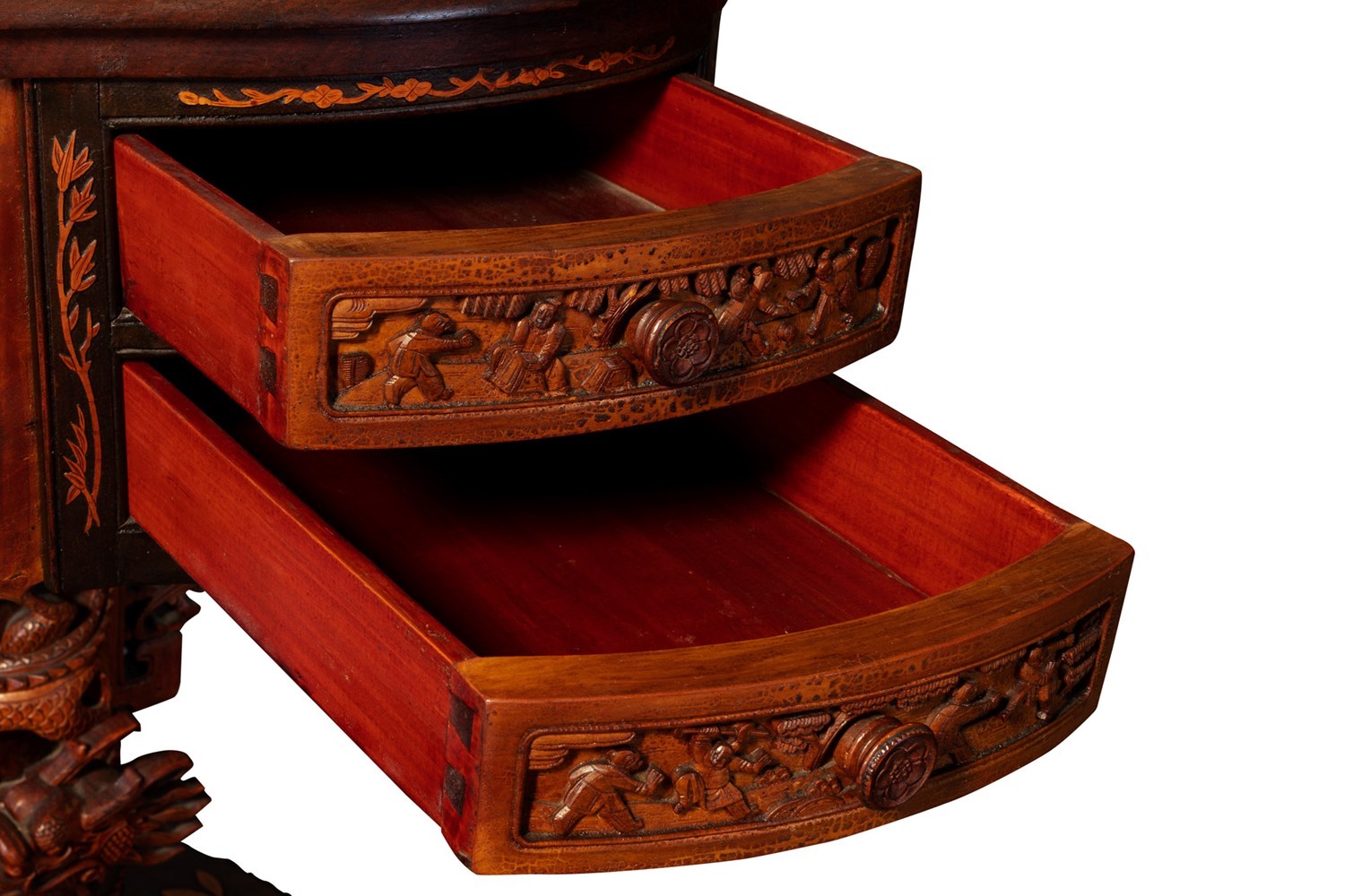 Scrittoio in palissandro, madreperla e bambù, con poltrona intarsiata, arte orientale 1880-90 circa