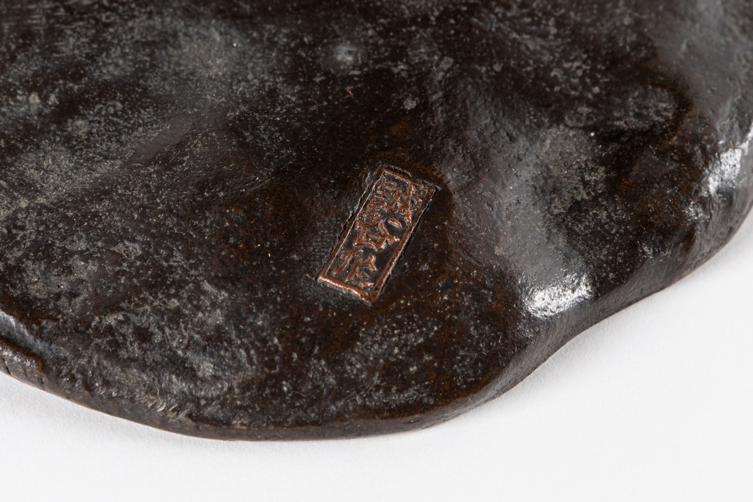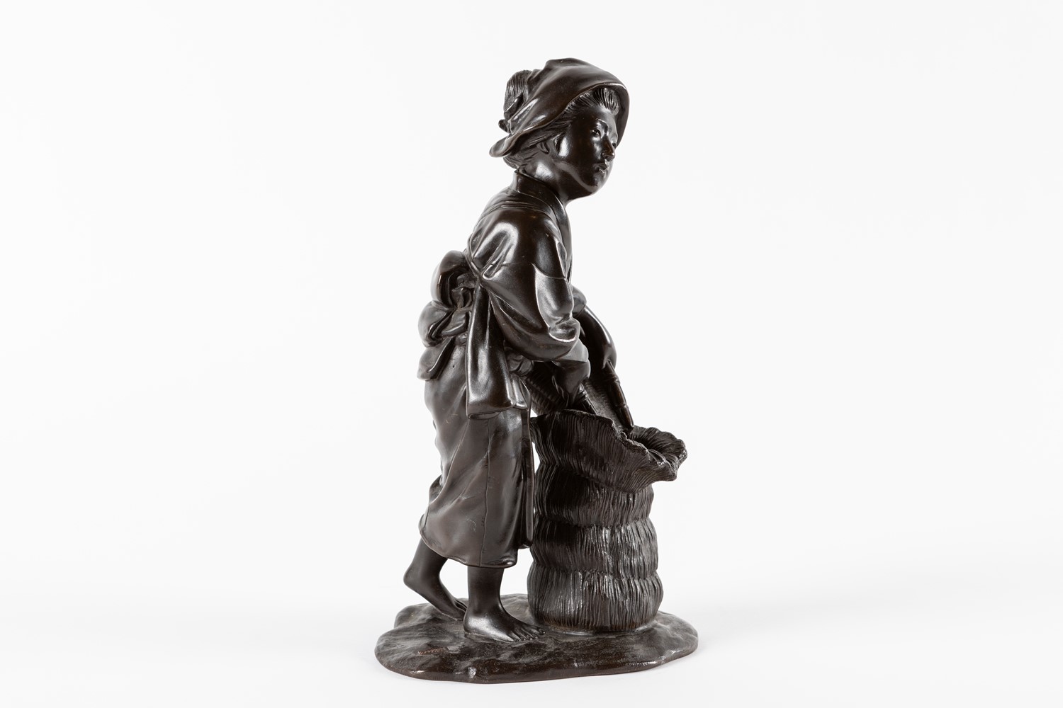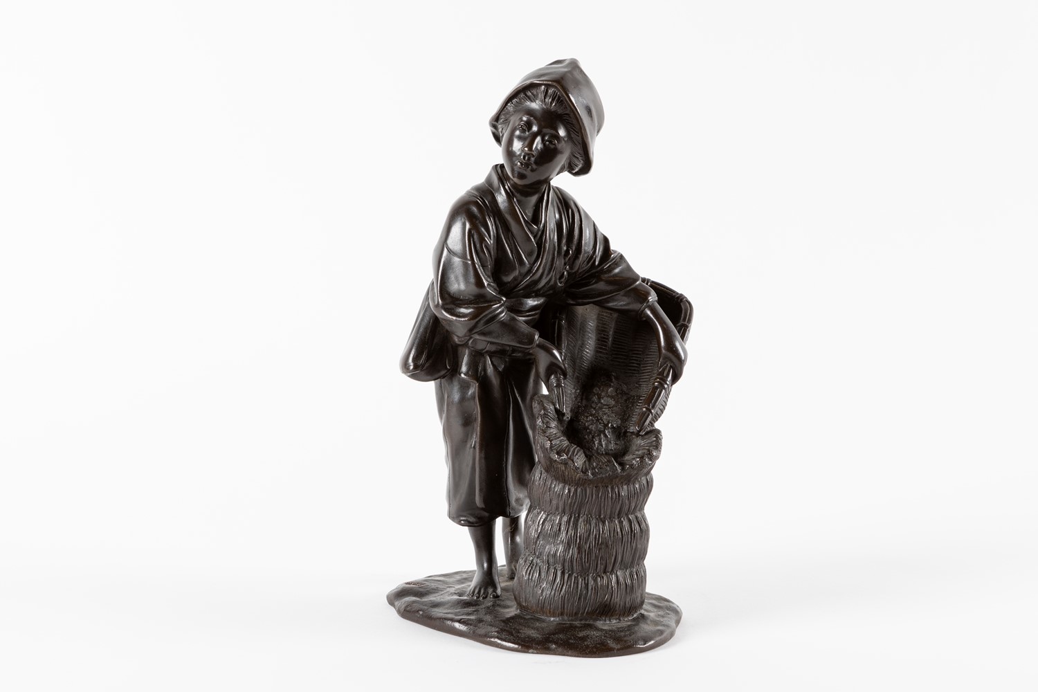 Scultura in bronzo raffigurante giovane contadina con cesta, Giappone periodo Meiji