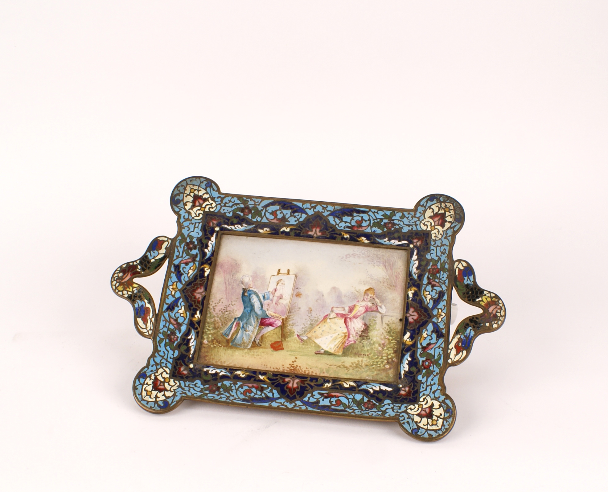 PICCOLO VASSOIO IN BRONZO DORATO E SMALTI POLICROMI Francia XIX Sec. con al centro una placca rettangolare in porcellana dipinta in policromia a raffigurare un pittore e la sua modella, firmata Monpert in basso a destra 28x19 cm.