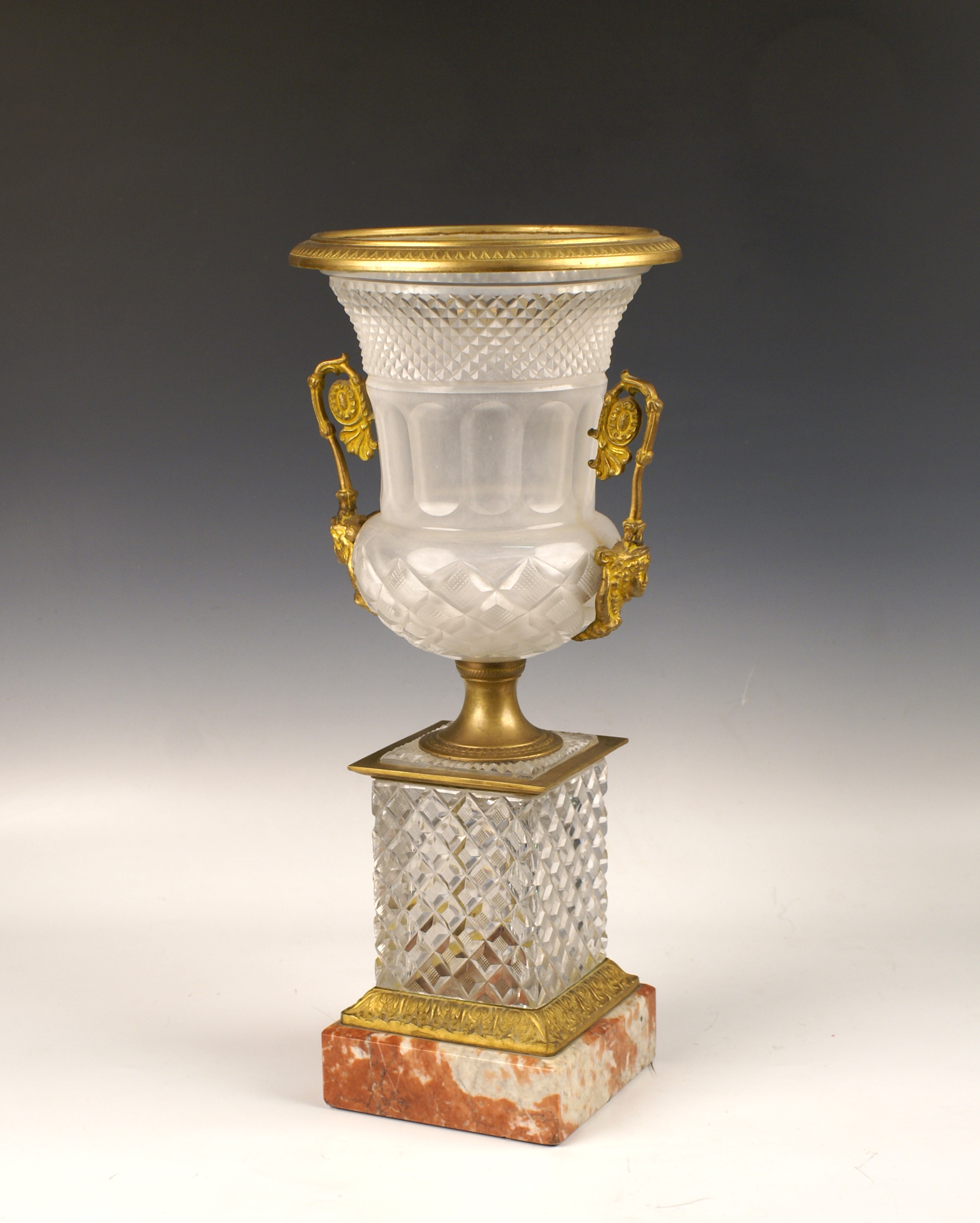 VASO IN CRISTALLO MOLATO E BRONZO DORATO Francia fine del XIX Sec. poggiante su base squadrata in marmo h. 43 cm.
