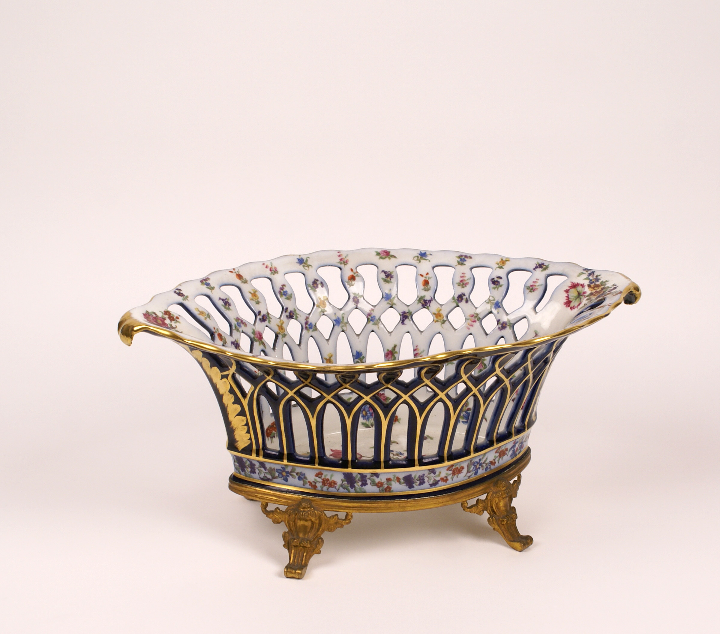 CENTROTAVOLA IN PORCELLANA Francia fine del XIX Sec. di forma ovale e traforato dipinto in policromia, decorato a motivi floreali e parzialmente dorato, poggiante su base in bronzo dorato con terminali a voluta 17x37x21 cm.