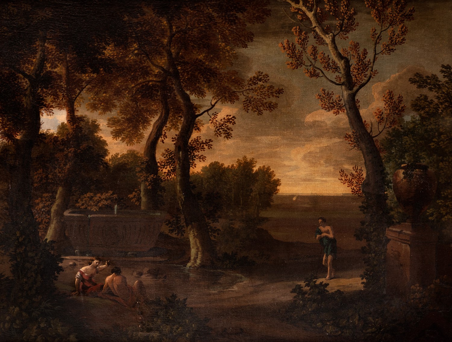 Scuola romana, secolo XVII - Paesaggio arcadico con astanti