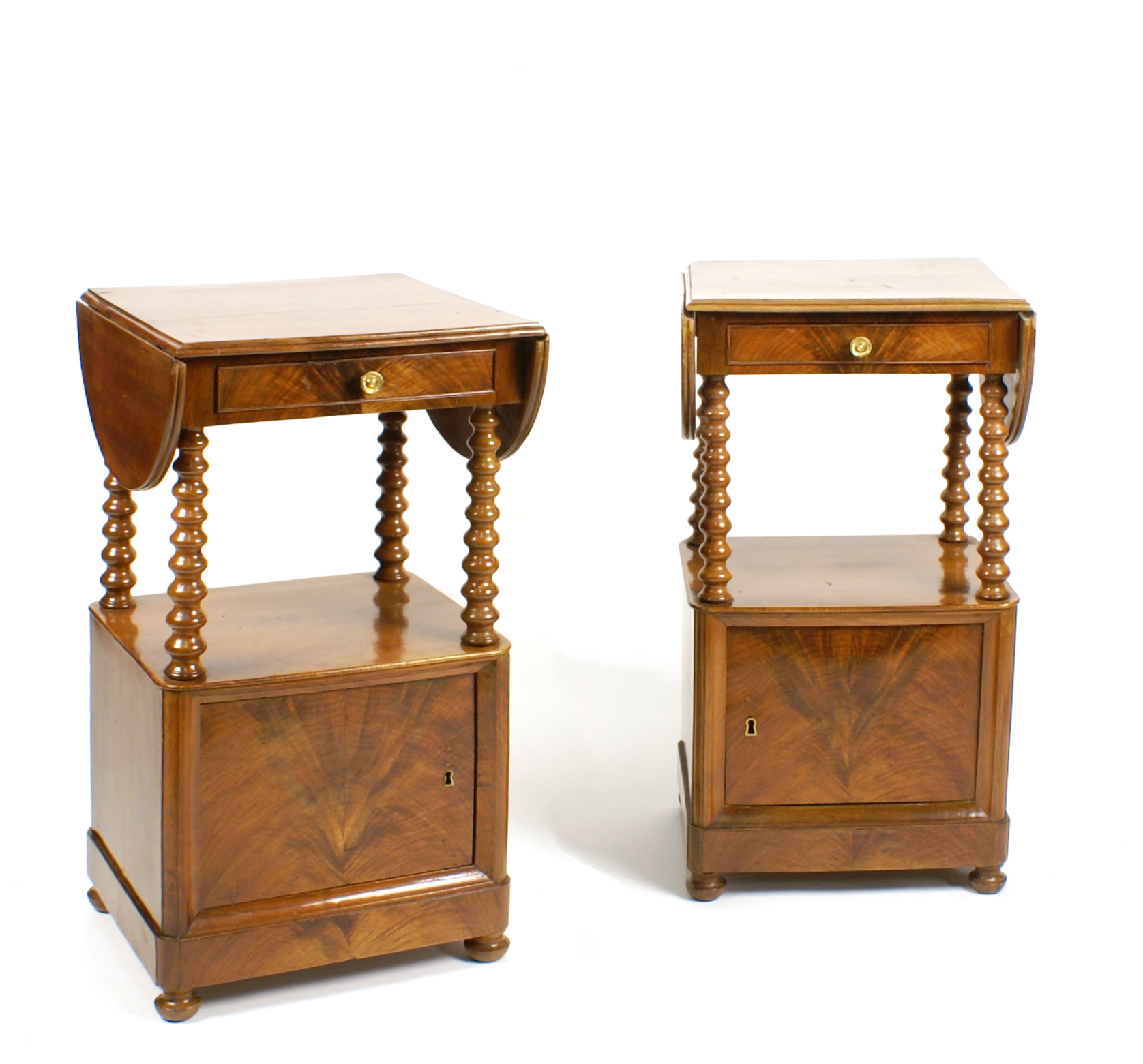 COPPIA DI COMODINI Italia vecchia manifattura in noce e piuma di noce, piani quadrati con alette laterali fronte ad un cassetto ed uno sportello delimitato da colonne in legno tornito 76x41x38 cm.