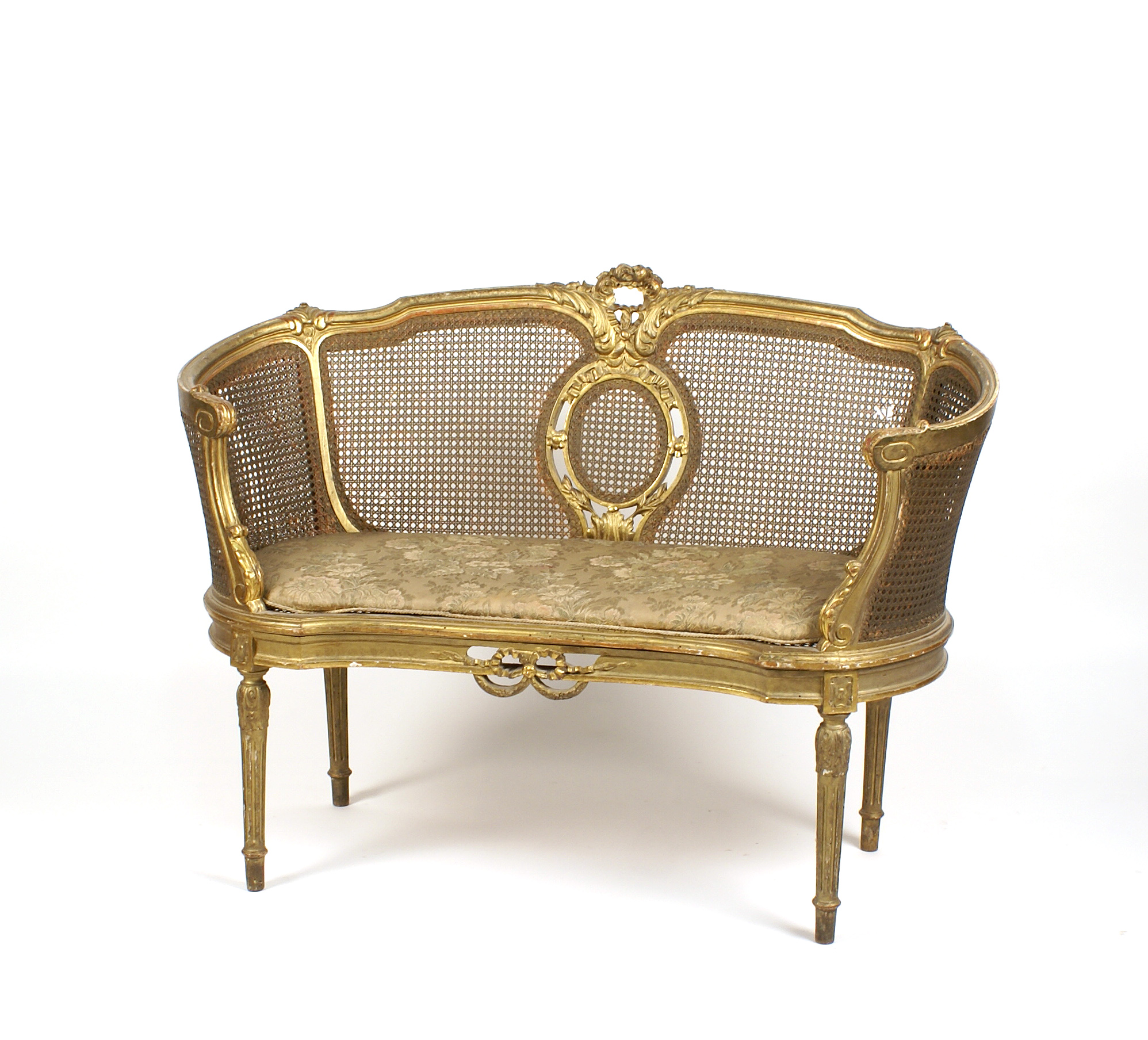 DIVANETTO DI LINEA MOSSA Francia vecchia manifattura in legno dorato ed intagliato a motivi di volute, schienale e seduta rivestiti in paglia di Vienna e centrati da un nodo d'amore e ghirlande di fiori 88x122x60 cm.