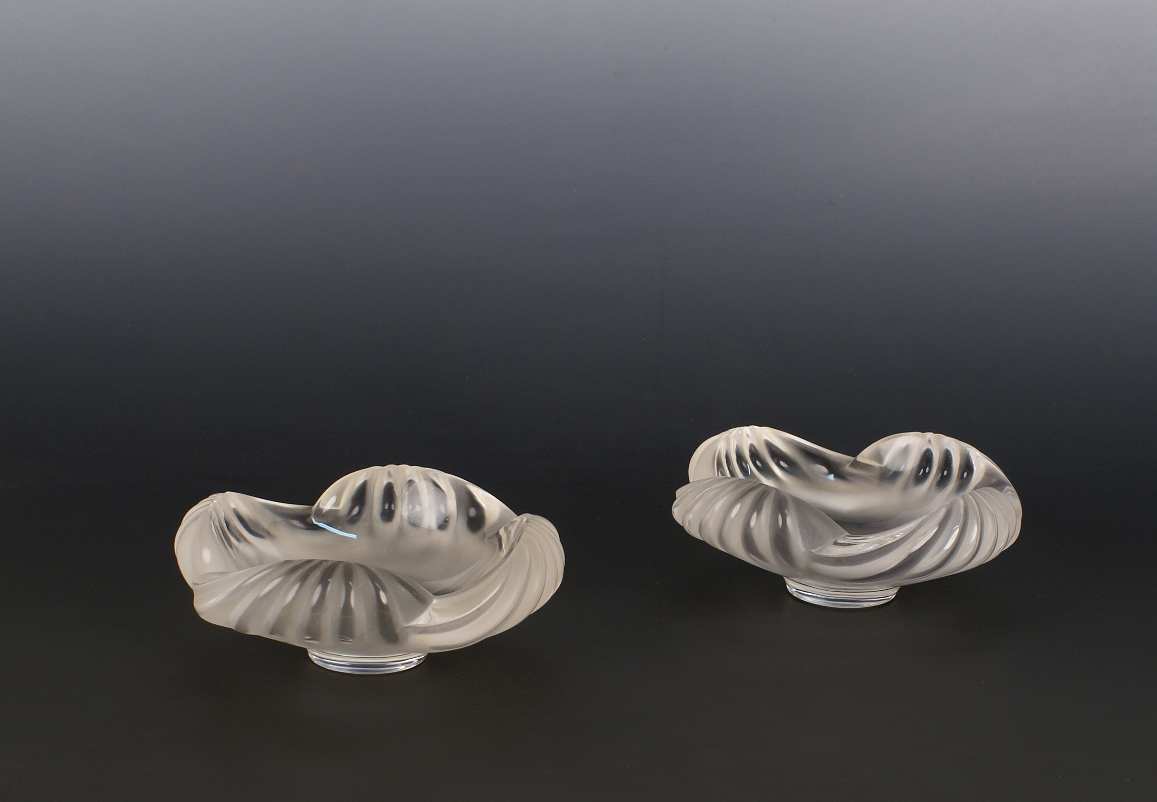 COPPIA DI POSACENERI Lalique Francia in cristallo satinato con profilo sagomato, firmati sotto la base 7x18 cm.