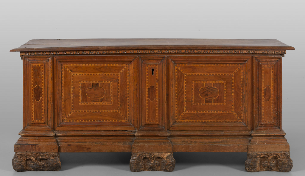 Cassapanca in noce intarsiata a filetti, Lombardia I metà sec. XVIII