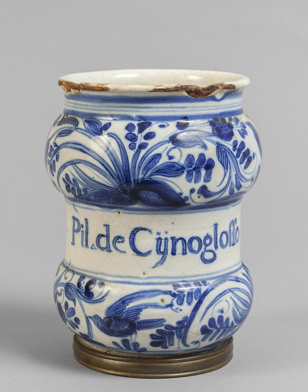 Albarello in ceramica bianca e blu, decorazione a tappezzeria con scritta medicinale "Pil de cynogloffo", marca Tromba, Savona sec.XVII